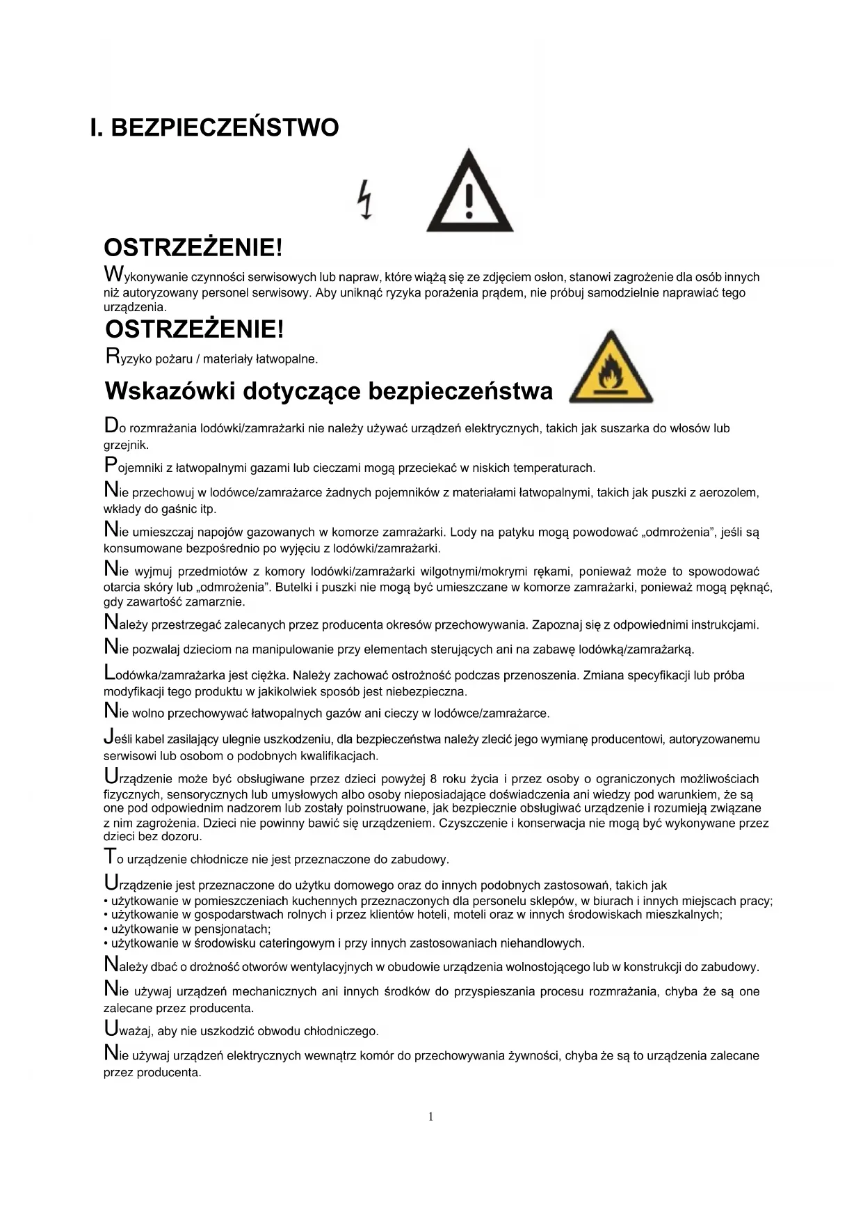OSTRZEŻENIE! Wykonywanie czynności serwisowych lub napraw, które wiążą się ze zdjęciem osłon, stanowi zagrożenie dla osób innych niż autoryzowany personel serwisowy. Aby uniknąć ryzyka porażenia prądem, nie próbuj samodzielnie naprawiać tego urządzenia. OSTRZEŻENIE! Ryzyko pożaru / materiały łatwopalne. Wskazówki dotyczące bezpieczeństwa Do rozmrażania lodówki/zamrażarki nie należy używać urządzeń elektrycznych, takich jak suszarka do włosów lub grzejnik. Pojemniki z łatwopalnymi gazami lub cieczami mogą przeciekać w niskich temperaturach. Nie przechowuj w lodówce/zamrażarce żadnych pojemników z materiałami łatwopalnymi, takich jak puszki z aerozolem, wkłady do gaśnic itp. Nie umieszczaj napojów gazowanych w komorze zamrażarki. Lody na patyku mogą powodować „odmrożenia”, jeśli są konsumowane bezpośrednio po wyjęciu z lodówki/zamrażarki. Nie wyjmuj przedmiotów z komory lodówki/zamrażarki wilgotnymi/mokrymi rękami, ponieważ może to spowodować otarcia skóry lub „odmrożenia”. Butelki i puszki nie mogą być umieszczane w komorze zamrażarki, ponieważ mogą pęknąć, gdy zawartość zamarznie. Należy przestrzegać zalecanych przez producenta okresów przechowywania. Zapoznaj się z odpowiednimi instrukcjami. Nie pozwalaj dzieciom na manipulowanie przy elementach sterujących ani na zabawę lodówką/zamrażarką. Lodówka/zamrażarka jest ciężka. Należy zachować ostrożność podczas przenoszenia. Zmiana specyfikacji lub próba modyfikacji tego produktu w jakikolwiek sposób jest niebezpieczna. Nie wolno przechowywać łatwopalnych gazów ani cieczy w lodówce/zamrażarce. Jeśli kabel zasilający ulegnie uszkodzeniu, dla bezpieczeństwa należy zlecić jego wymianę producentowi, autoryzowanemu serwisowi lub osobom o podobnych kwalifikacjach. Urządzenie może być obsługiwane przez dzieci powyżej 8 roku życia i przez osoby o ograniczonych możliwościach fizycznych, sensorycznych lub umysłowych albo osoby nieposiadające doświadczenia ani wiedzy pod warunkiem, że są one pod odpowiednim nadzorem lub zostały poinstruowane, jak bezpiecznie obsługiwać urządzenie i rozumieją związane z nim zagrożenia. Dzieci nie powinny bawić się urządzeniem. Czyszczenie i konserwacja nie mogą być wykonywane przez dzieci bez dozoru. To urządzenie chłodnicze nie jest przeznaczone do zabudowy. Urządzenie jest przeznaczone do użytku domowego oraz do innych podobnych zastosowań, takich jak