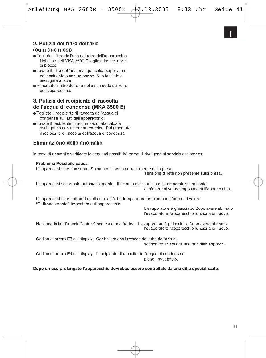 Anleitung MKA 2600E + 3500E 12.12.2003 8:32 Uhr Seite 50Rozwiązywanie problemów W razie usterek, przed wezwaniem serwisu naprawczego należy sprawdzić następujące możliwości. Problem Możliwa przyczyna Urządzenie nie pracuje Nieprawidłowo podłączona wtyczka Brak napięcia w gniazdku sieciowym Urządzenie zatrzymuje się automatycznie Wyłącza się czasomierz lub temperatura w pomieszczeniu jest niższa niż ustawiona na urządzeniu Urządzenie nie chłodzi w trybie pracy „Chłodzenie” Temperatura w pomieszczeniu jest niższa niż ustawiona na urządzeniu. Parownik zamarzł. Po rozmrożeniu parownika urządzenie pracuje nada W trybie pracy „Osuszanie” brak nadmuchu chłodnego Parownik zamarzł. Po rozmrożeniu parownika powietrza urządzenie pracuje nadal Na wyświetlaczu pojawia się kod usterki E3 Sprawdzić przyłącze węża wywiewu powietrza i filtr powietrza na obecność zanieczyszczeń Na wyświetlaczu pojawia się kod usterki E4 Zbiornik skroplin jest pełen- opróżnić Urządzenie po dłuższym użytkowaniu powinno zostać sprawdzone w warsztacie specjalistycznym.