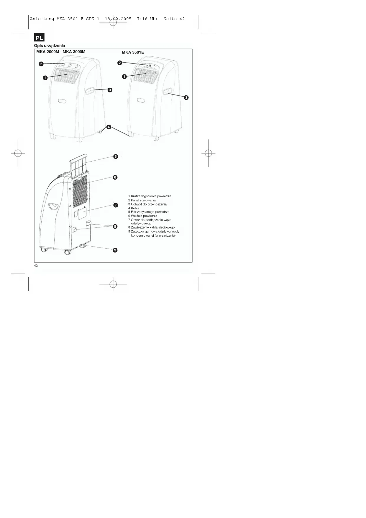 Opis urządzenia Anleitung MKA 3501 E SPK 1 18.02.2005 7:18 Uhr Seite 42* Dokładnie przeczytać instrukcję obsługi przed uruchomieniem urządzenia i zachować. Kupując przenośny klimatyzator dokonaliście Państwo dobrego wyboru. Urządzenie jest profesjonalnie skonstruowane i zapewnia maksymalny komfort na wiele lat, jeśli będzie użytkowane zgodnie z instrukcją. Dokładnie przeczytać instrukcję obsługi i zachować w celu uzyskania późniejszych dodatkowych informacji. Przed użyciem