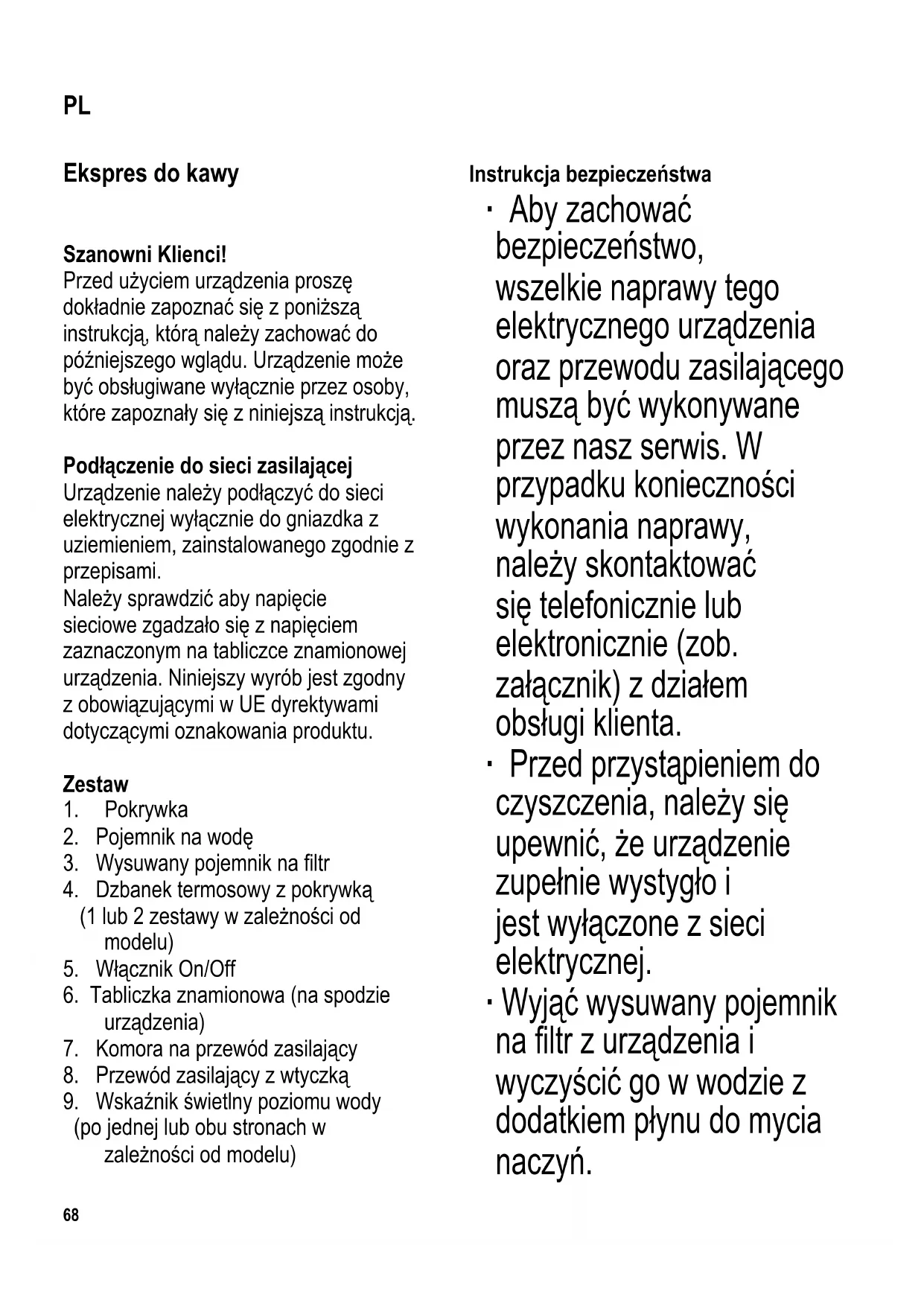 ∙ Poużyciunależyopłukać wnętrzedzbankai przetrzećzewnętrzną stronęwilgotnąszmatką. ∙ Szczegółoweinformacje na temat czyszczenia urządzeniaznajdująsię w punkcie Czyszczenie i konserwacja. ∙ Abyniedopuścićdo porażeniaprądem,nie czyścićurządzenia cieczamianiniezanurzać go. ∙ Ostrzeżenie! Nieprawidłoweużytkowanie urządzeniamoże doprowadzićdopoważnych obrażeńciała. ∙ Ostrzeżenie:Nieosłonięte częściurządzenia rozgrzewająsiędo wysokiej temperatury w trakciepracyipozostają gorąceprzezjakiśczaspo jejzakończeniu. ∙ Podczasużytkowania urządzenianiewolno umieszczaćgowewnątrz szafy. ∙ Urządzenieprzeznaczone jestdozastosowań domowych lub podobnych, jak np. w - kuchniach biurowych lub innych miejscach pracy; - agroturystyce; - hotelach, motelach itp. oraz innych podobnych lokalach (przez klientów); - pensjonatach. ∙ Osoby o ograniczonych zdolnościachzycznych, czuciowych lub psychicznych albo nieposiadającestosownego doświadczenialubwiedzy, atakżedzieci(wwieku conajmniej8lat),mogą korzystaćzurządzenia, podwarunkiemżeznajdują siępodnadzoremlub70 104 x 142 mm zostałypoinstruowane,jak używaćurządzeniaisąw pełniświadomewszelkich zagrożeńiwymaganych środkówostrożności. ∙ Niedopuszczaćdo używaniaurządzeniajako zabawki przez dzieci. ∙ Niewolnopozwalać dzieciom na wykonywanie jakichkolwiek prac związanychbezpośrednio zkonserwacjąlub czyszczeniemurządzenia, ajeżelijuż,todzieckomusi miećconajmniej8latibyć nadzorowaneprzezosobę dorosłą. ∙ Niedopuszczaćdo urządzeniaijegoprzewodu zasilającegodzieciponiżej 8 lat. ∙ Ostrzeżenie:Niepozwalać,abydzieci miałydostępdoelementówopakowania, ponieważmogąonespowodować zagrożenie,np.uduszenia. ∙ Przedużyciemnależydokładnie sprawdzić,czygłównykorpus urządzeniaiwszystkieelementy czynnościowesąsprawneinienoszą śladówuszkodzenia.Jeżeliurządzenie np.spadłonatwardąpowierzchnięalbo przewódzasilającyzostałnarażony nazbytsilneszarpnięcie,nienadaje sięonododalszegoużytku:nawet najmniejsza, niewidoczna usterka powstałaztegopowodu,możemieć ujemnywpływnadziałanieurządzeniai bezpieczeństwoużytkownika. ∙ Podczasparzeniakawy,urządzenie musibyćustawionenarównejinie śliskiejpowierzchni,odpornejna ewentualne zaplamienie i rozpryski. ∙ Urządzenieorazprzewódsieciowy niemogąstykaćsięzgorącymi powierzchniami,aniteżbyćpoddawane działaniuwysokichtemperatur. ∙ Przed otwieraniem ekspresu lub wyjmowaniem z niego jakichkolwiek elementówczynnościowychi akcesoriów,należyurządzeniawyłączyć ipoczekaćnajegoochłodzenie. Wtensposóbmożnazapobiec niebezpieczeństwuwydzielaniasiępary lubgorącejwody. ∙ Dziecipowinnyznajdowaćsiępodstałą opieką,abyniedopuścićdoużywania przeznieurządzeniajakozabawki. ∙ Dzbaneknależyzawszezamykać przeznaczonądlaniegopokrywką przelewową.Dzbanektermicznynależy chronićprzeddziećmi. ∙ Należywyjąćwtyczkęzgniazdka elektrycznego: - w przypadku wadliwej pracy urządzenia, - podczas czyszczenia,104 x 142 mm