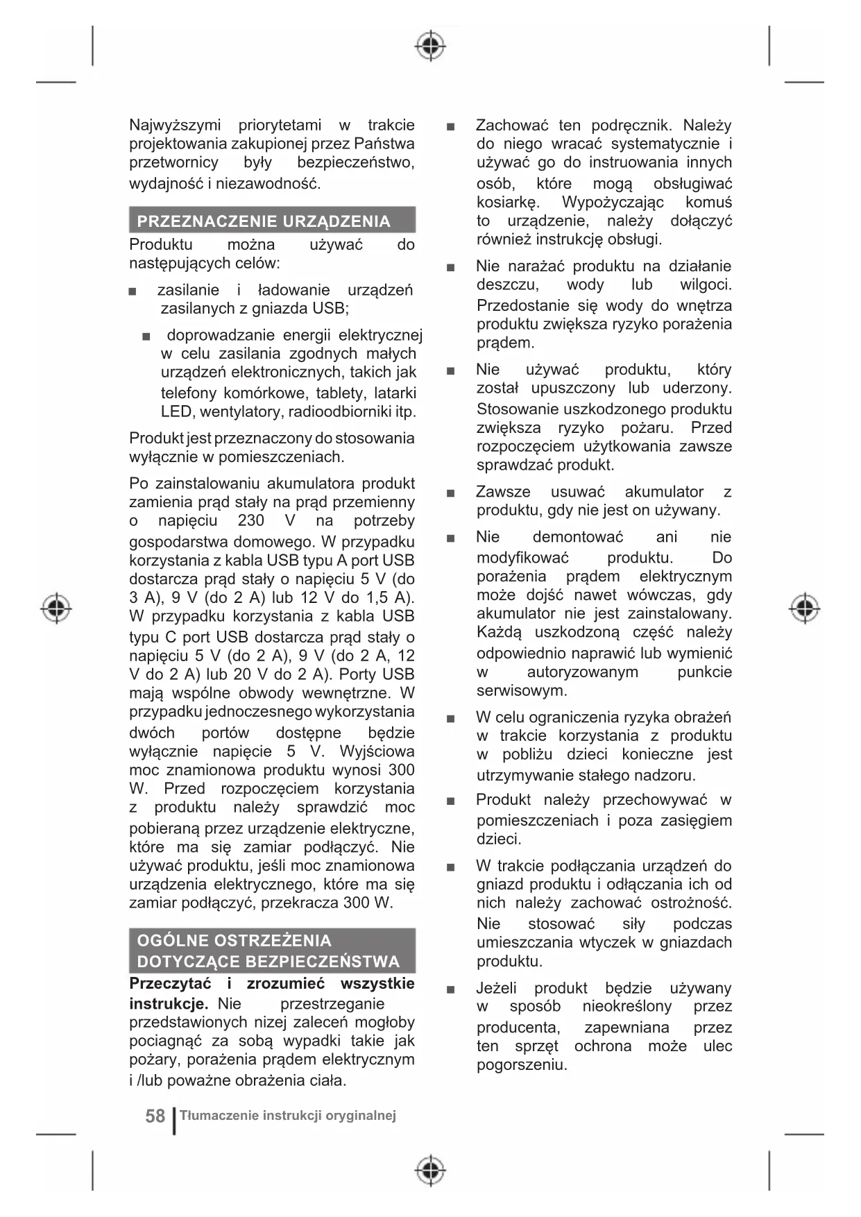 Produktu można używać do następujących celów: ■ zasilanie i ładowanie urządzeń zasilanych z gniazda USB; ■ doprowadzanie energii elektrycznej w celu zasilania zgodnych małych urządzeń elektronicznych, takich jak telefony komórkowe, tablety, latarki LED, wentylatory, radioodbiorniki itp. Produkt jest przeznaczony do stosowania wyłącznie w pomieszczeniach. Po zainstalowaniu akumulatora produkt zamienia prąd stały na prąd przemienny o napięciu 230 V na potrzeby gospodarstwa domowego. W przypadku korzystania z kabla USB typu A port USB dostarcza prąd stały o napięciu 5 V (do 3 A), 9 V (do 2 A) lub 12 V do 1,5 A). W przypadku korzystania z kabla USB typu C port USB dostarcza prąd stały o napięciu 5 V (do 2 A), 9 V (do 2 A, 12 V do 2 A) lub 20 V do 2 A). Porty USB mają wspólne obwody wewnętrzne. W przypadku jednoczesnego wykorzystania dwóch portów dostępne będzie wyłącznie napięcie 5 V. Wyjściowa moc znamionowa produktu wynosi 300 W. Przed rozpoczęciem korzystania z produktu należy sprawdzić moc pobieraną przez urządzenie elektryczne, które ma się zamiar podłączyć. Nie używać produktu, jeśli moc znamionowa urządzenia elektrycznego, które ma się zamiar podłączyć, przekracza 300 W.