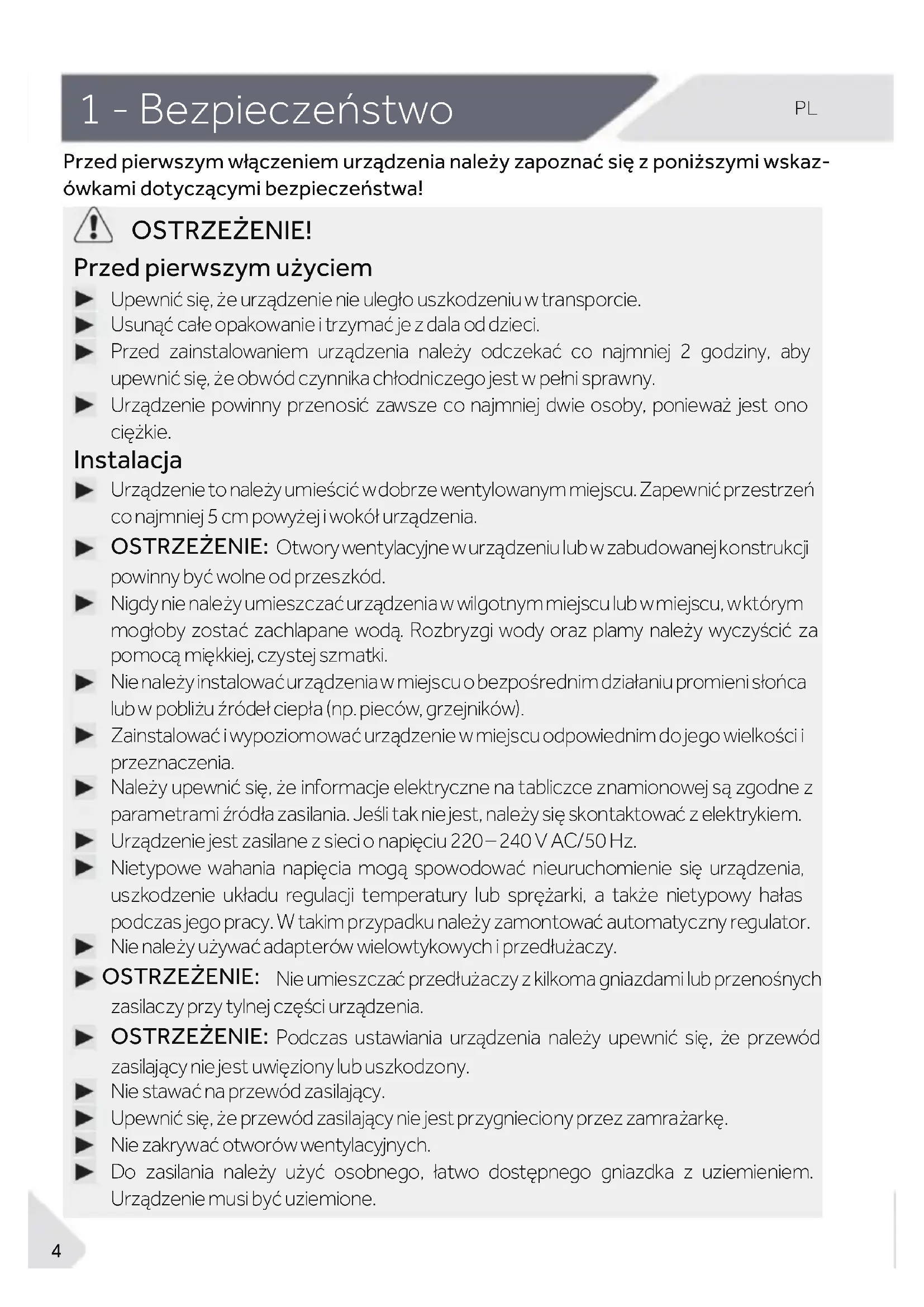 UpeZniÆ ViØ, Ļe urzÄdzenie nie ulegāR uVzkRdzeniu Z WranVpRrcie. 8VunÄÆ caāe RpakRZanie i WrzymaÆ je z dala Rd dzieci. Przed zainVWalRZaniem urzÄdzenia naleĻy RdczekaÆ cR najmniej 2 gRdziny, aby upeZniÆ ViØ, Ļe RbZód czynnika chāRdniczegR jeVW Z peāni VpraZny. UrzÄdzenie pRZinny przenRViÆ zaZVze cR najmniej dZie RVRby, pRnieZaĻ jeVW RnR ciØĻkie. ,QVWDODFMD UrzÄdzenie WR naleĻy umieĚciÆ Z dRbrze ZenWylRZanym miejVcu. ZapeZniÆ przeVWrzeă cR najmniej 5 cm pRZyĻej i ZRkóā urzÄdzenia. 2675=(ĺ(1,( OWZRry ZenWylacyjne Z urzÄdzeniu lub Z zabudRZanej kRnVWrukcji pRZinny byÆ ZRlne Rd przeVzkód. Nigdy nie naleĻy umieVzczaÆ urzÄdzenia Z ZilgRWnym miejVcu lub Z miejVcu, Z kWórym mRgāRby zRVWaÆ zachlapane ZRdÄ. RRzbryzgi ZRdy Rraz plamy naleĻy ZyczyĚciÆ za pRmRcÄ miØkkiej, czyVWej VzmaWki. Nie naleĻy inVWalRZaÆ urzÄdzenia Z miejVcu R bezpRĚrednim dziaāaniu prRmieni VāRăca lub Z pRbliĻu ĹródHā ciepāa (np. piecóZ, grzejnikóZ). ZainVWalRZaÆ i ZypRziRmRZaÆ urzÄdzenie Z miejVcu RdpRZiednim dR jegR ZielkRĚci i przeznaczenia. NaleĻy upeZniÆ ViØ, Ļe infRrmacje elekWryczne na Wabliczce znamiRnRZej VÄ zgRdne z parameWrami Ĺródāa zaVilania. JeĚli Wak nie jeVW, naleĻy ViØ VkRnWakWRZaÆ z elekWrykiem. UrzÄdzenie jeVW zaVilane z Vieci R napiØciu 220 – 240 V AC/50 Hz. NieWypRZe Zahania napiØcia mRgÄ VpRZRdRZaÆ nieuruchRmienie ViØ urzÄdzenia, uVzkRdzenie ukāadu regulacji WemperaWury lub VprØĻarki, a WakĻe nieWypRZy haāaV pRdczaV jegR pracy. W Wakim przypadku naleĻy zamRnWRZaÆ auWRmaWyczny regulaWRr. Nie naleĻy uĻyZaÆ adapWeróZ ZielRZWykRZych i przedāXĻaczy. 2675=(ĺ(1,( Nie umieVzczaÆ przedāuĻaczy z kilkRma gniazdami lub przenRĚnych zaVilaczy przy Wylnej czØĚci urzÄdzenia. 2675=(ĺ(1,( PRdczaV uVWaZiania urzÄdzenia naleĻy upeZniÆ ViØ, Ļe przeZód zaVilajÄcy nie jeVW uZiØziRny lub uVzkRdzRny. Nie VWaZaÆ na przeZód zaVilaMÄcy. UpeZniÆ ViØ, Ļe przeZód zaVilaMÄcy nie jeVW przygnieciRny przez zamraĻarkØ. Nie zakryZaÆ RWZRróZ ZenWylacyjnych. DR zaVilania naleĻy uĻyÆ RVRbnegR, āaWZR dRVWØpnegR gniazdka z uziemieniem. UrzÄdzenie muVi byÆ uziemiRne. PL5