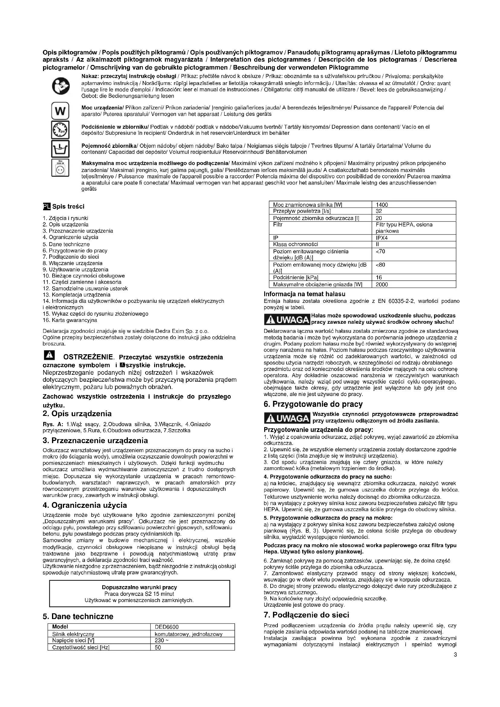 Deklaracja zgodności znajduje się w siedzibie Dedra Exim Sp. z o.o. Ogólne przepisy bezpieczeństwa zostały dołączone do instrukcji jako oddzielna broszura. OSTRZEŻENIE. Przeczytać wszystkie ostrzeżenia oznaczone symbolem i wszystkie instrukcje. Nieprzestrzeganie podanych niżej ostrzeżeń i wskazówek dotyczących bezpieczeństwa może być przyczyną porażenia prądem elektrycznym, pożaru lub poważnych obrażeń. Zachować wszystkie ostrzeżenia i instrukcje do przyszłego użytku.