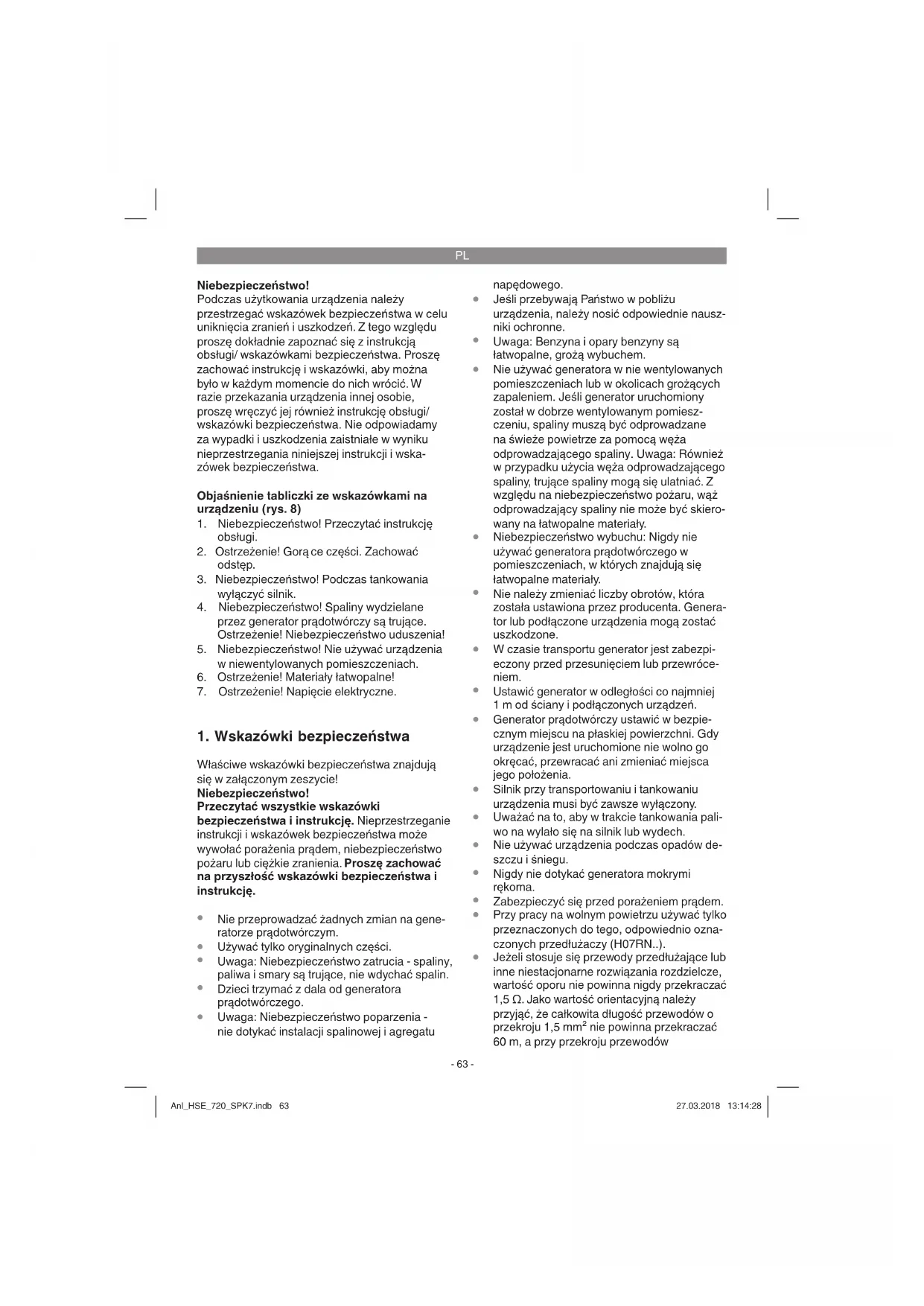 Jeżeli stosuje się przewody przedłużające lub inne niestacjonarne rozwiązania rozdzielcze, wartość oporu nie powinna nigdy przekraczać 1,5 Ω. Jako wartość orientacyjną należy przyjąć, że całkowita długość przewodów o przekroju 1,5 mm² nie powinna przekraczać 60 m, a przy przekroju przewodów Anl_HSE_720_SPK7.indb 63Anl_HSE_720_SPK7.indb 63 27.03.2018 13:14:2827.03.2018 13:14:28PL