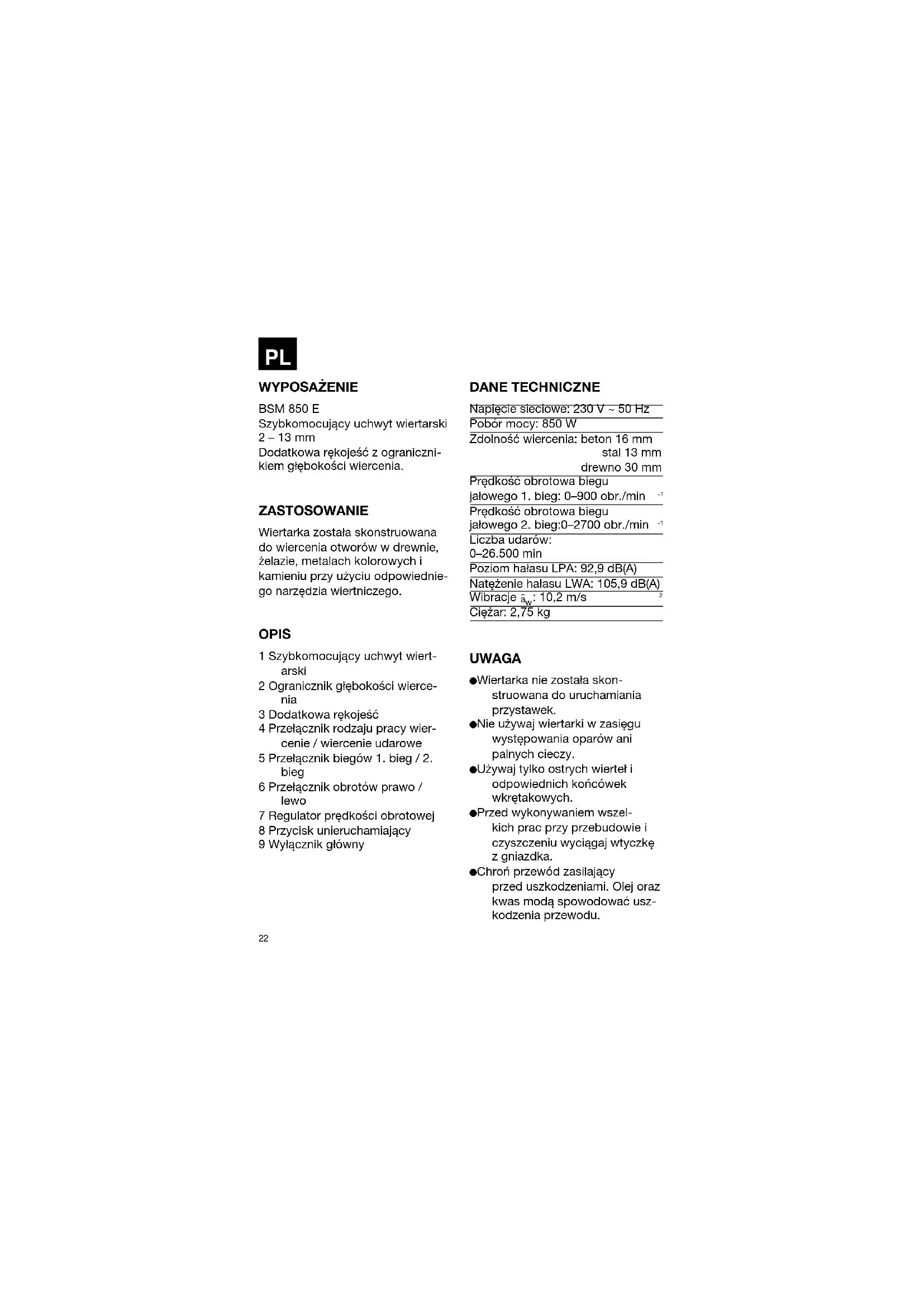 WYPOSAŻENIE BSM 850 E Szybkomocujący uchwyt wiertarski 2 – 13 mm Dodatkowa rękojeść z ograniczni- kiem głębokości wiercenia. ZASTOSOWANIE Wiertarka została skonstruowana do wiercenia otworów w drewnie, żelazie, metalach kolorowych i kamieniu przy użyciu odpowiednie- go narzędzia wiertniczego. OPIS 1 Szybkomocujący uchwyt wiert- arski 2 Ogranicznik głębokości wierce- nia 3 Dodatkowa rękojeść 4 Przełącznik rodzaju pracy wier- cenie / wiercenie udarowe 5 Przełącznik biegów 1. bieg / 2. bieg 6 Przełącznik obrotów prawo / lewo 7 Regulator prędkości obrotowej 8 Przycisk unieruchamiający 9 Wyłącznik główny DANE TECHNICZNE Napięcie sieciowe: 230 V ~ 50 Hz Pobór mocy: 850 W Zdolność wiercenia: beton 16 mm stal 13 mm drewno 30 mm Prędkość obrotowa biegu jałowego 1. bieg: 0–900 obr./min