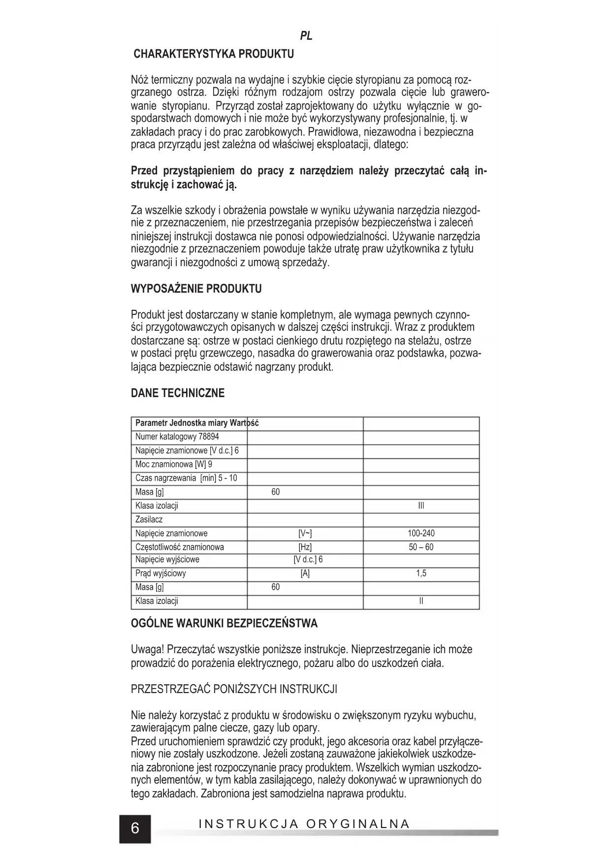 Produkt jest dostarczany w stanie kompletnym, ale wymaga pewnych czynno- ści przygotowawczych opisanych w dalszej części instrukcji. Wraz z produktem dostarczane są: ostrze w postaci cienkiego drutu rozpiętego na stelażu, ostrze w postaci prętu grzewczego, nasadka do grawerowania oraz podstawka, pozwa- lająca bezpiecznie odstawić nagrzany produkt. DANE TECHNICZNE Parametr Jednostka miary Wartość Numer katalogowy 78894 Napięcie znamionowe [V d.c.] 6 Moc znamionowa [W] 9 Czas nagrzewania [min] 5 - 10 Masa [g] 60 Klasa izolacji III Zasilacz Napięcie znamionowe [V~] 100-240 Częstotliwość znamionowa [Hz] 50 – 60 Napięcie wyjściowe [V d.c.] 6 Prąd wyjściowy [A] 1,5 Masa [g] 60 Klasa izolacji II