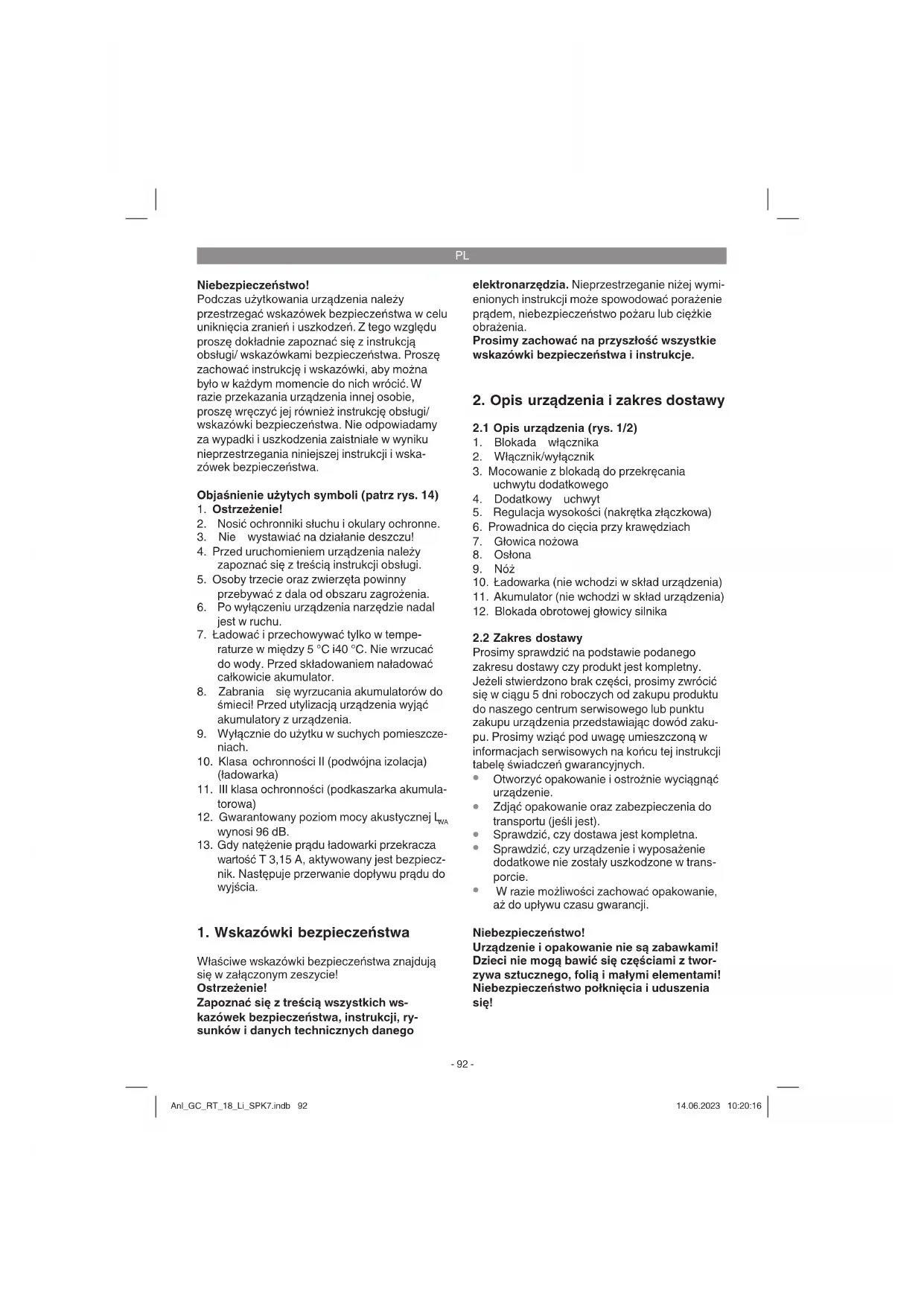 W razie możliwości zachować opakowanie, aż do upływu czasu gwarancji. Niebezpieczeństwo! Urządzenie i opakowanie nie są zabawkami! Dzieci nie mogą bawić się częściami z twor- zywa sztucznego, folią i małymi elementami! Niebezpieczeństwo połknięcia i uduszenia się! Anl_GC_RT_18_Li_SPK7.indb 92Anl_GC_RT_18_Li_SPK7.indb 92 14.06.2023 10:20:1614.06.2023 10:20:16PL
