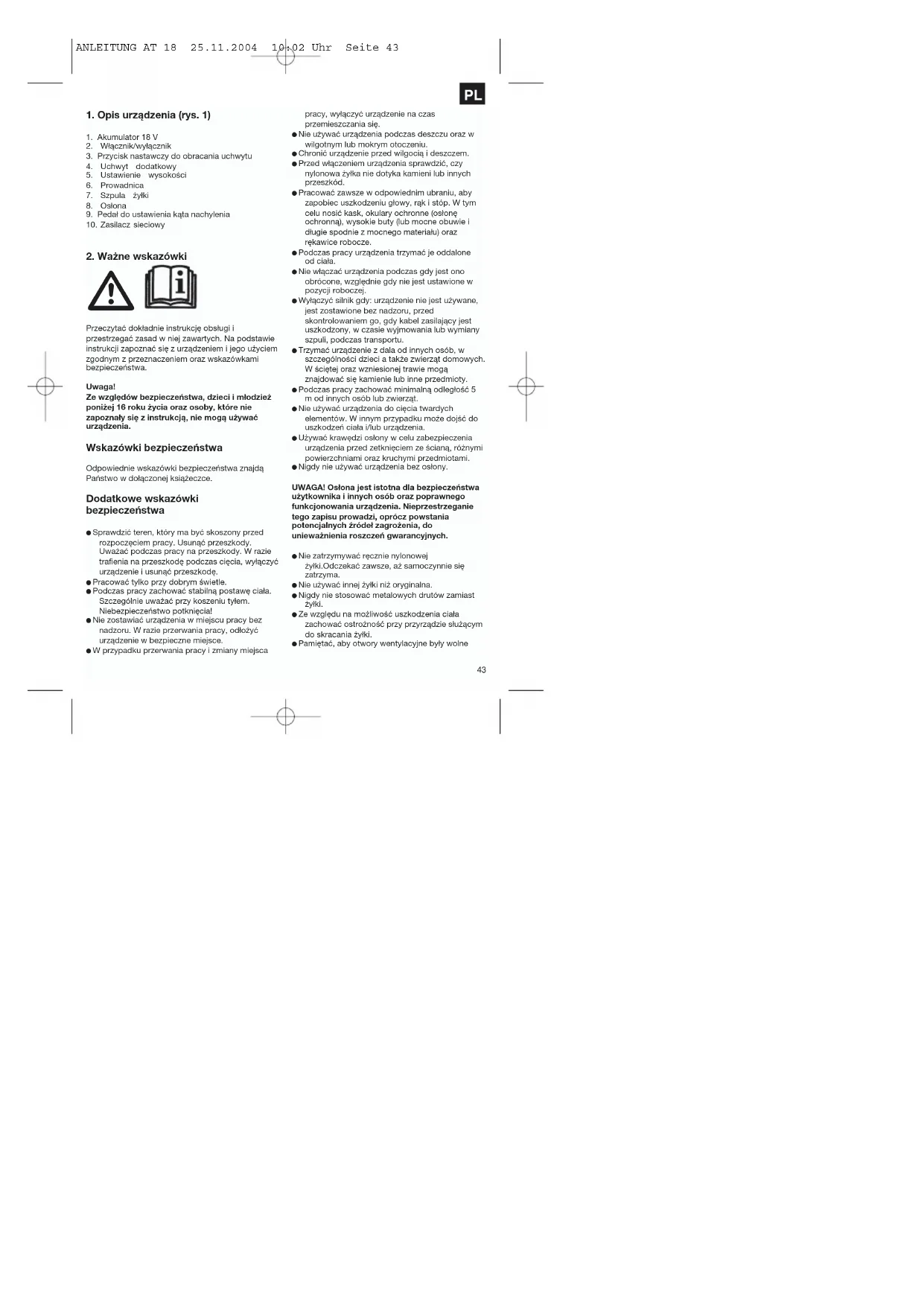 Przeczytać dokładnie instrukcję obsługi i przestrzegać zasad w niej zawartych. Na podstawie instrukcji zapoznać się z urządzeniem i jego użyciem zgodnym z przeznaczeniem oraz wskazówkami bezpieczeństwa. Uwaga! Ze względów bezpieczeństwa, dzieci i młodzież poniżej 16 roku życia oraz osoby, które nie zapoznały się z instrukcją, nie mogą używać urządzenia. Wskazówki bezpieczeństwa Odpowiednie wskazówki bezpieczeństwa znajdą Państwo w dołączonej książeczce. Dodatkowe wskazówki bezpieczeństwa Sprawdzić teren, który ma być skoszony przed rozpoczęciem pracy. Usunąć przeszkody. Uważać podczas pracy na przeszkody. W razie trafienia na przeszkodę podczas cięcia, wyłączyć urządzenie i usunąć przeszkodę. Pracować tylko przy dobrym świetle. Podczas pracy zachować stabilną postawę ciała. Szczególnie uważać przy koszeniu tyłem. Niebezpieczeństwo potknięcia! Nie zostawiać urządzenia w miejscu pracy bez nadzoru. W razie przerwania pracy, odłożyć urządzenie w bezpieczne miejsce. W przypadku przerwania pracy i zmiany miejsca pracy, wyłączyć urządzenie na czas przemieszczania się. Nie używać urządzenia podczas deszczu oraz w wilgotnym lub mokrym otoczeniu. Chronić urządzenie przed wilgocią i deszczem. Przed włączeniem urządzenia sprawdzić, czy nylonowa żyłka nie dotyka kamieni lub innych przeszkód. Pracować zawsze w odpowiednim ubraniu, aby zapobiec uszkodzeniu głowy, rąk i stóp. W tym celu nosić kask, okulary ochronne (osłonę ochronną), wysokie buty (lub mocne obuwie i długie spodnie z mocnego materiału) oraz rękawice robocze. Podczas pracy urządzenia trzymać je oddalone od ciała. Nie włączać urządzenia podczas gdy jest ono obrócone, względnie gdy nie jest ustawione w pozycji roboczej. Wyłączyć silnik gdy: urządzenie nie jest używane, jest zostawione bez nadzoru, przed skontrolowaniem go, gdy kabel zasilający jest uszkodzony, w czasie wyjmowania lub wymiany szpuli, podczas transportu. Trzymać urządzenie z dala od innych osób, w szczególności dzieci a także zwierząt domowych. W ściętej oraz wzniesionej trawie mogą znajdować się kamienie lub inne przedmioty. Podczas pracy zachować minimalną odległość 5 m od innych osób lub zwierząt. Nie używać urządzenia do cięcia twardych elementów. W innym przypadku może dojść do uszkodzeń ciała i/lub urządzenia. Używać krawędzi osłony w celu zabezpieczenia urządzenia przed zetknięciem ze ścianą, różnymi powierzchniami oraz kruchymi przedmiotami. Nigdy nie używać urządzenia bez osłony. UWAGA! Osłona jest istotna dla bezpieczeństwa użytkownika i innych osób oraz poprawnego funkcjonowania urządzenia. Nieprzestrzeganie tego zapisu prowadzi, oprócz powstania potencjalnych źródeł zagrożenia, do unieważnienia roszczeń gwarancyjnych. Nie zatrzymywać ręcznie nylonowej żyłki.Odczekać zawsze, aż samoczynnie się zatrzyma. Nie używać innej żyłki niż oryginalna. Nigdy nie stosować metalowych drutów zamiast żyłki. Ze względu na możliwość uszkodzenia ciała zachować ostrożność przy przyrządzie służącym do skracania żyłki. Pamiętać, aby otwory wentylacyjne były wolne ANLEITUNG AT 18 25.11.2004 10:02 Uhr Seite 43od zanieczyszczeń. Nie kosić trawy, która nie rośnie na ziemi, np. na ścianach, kamieniach. W obszarze pracy użytkownik jest odpowiedzialny za szkody osób trzecich, które zostały wywołane w wyniku używania urządzenia. Nie przechodzić przez ulice i alejki z włączonym urządzeniem. Gdy urządzenie nie jest używane, przechowywać je w suchym i niedostępnym dla dzieci miejscu. Używać urządzenie tylko zgodnie z instrukcją i trzymać zawsze prostopadle do podłoża. Każde inne ustawienie może być niebezpieczne. Sprawdzać regularnie prawidłowość mocowania śrub. Z przeznaczonej do cięcia powierzchni usunąć kable i inne przeszkody. Jeśli urządzenie musi zostać podniesione w celu przetransportowania go, wyłączyć silnik i odczekać do jego całkowitego zatrzymania. Wyłączyć urządzenia w razie pozostawienia go i wyjąć wtyczkę z kontaktu. Nie kierować pracującego urządzenie na twarde przeszkody. W innym przypadku może dojść do uszkodzeń ciała i/lub urządzenia. W celu utrzymania urządzenia w dobrym stanie, używać tylko oryginalnych części zamiennych. Przed użyciem i/lub po zderzeniu z przeszkodą, sprawdzić oznaki zużycia lub uszkodzenia, w razie konieczności przeprowadzenia naprawy skontaktować się z autoryzowanym serwisem. Trzymać ręce i stopy zawsze w bezpiecznej odległości od części tnącej, przede wszystkim w momencie włączania silnika. Po wysunięciu nowej żyłki trzymać urządzenie w normalnej pozycji przed jego włączeniem. Wyciągnąć akumulator przez sprawdzaniem, czyszczeniem lub innymi pracami przy urządzeniu i gdy nie jest ono używane. Uwaga! Po wyłączeniu żyłka obraca się nadal przez kilka sekund.