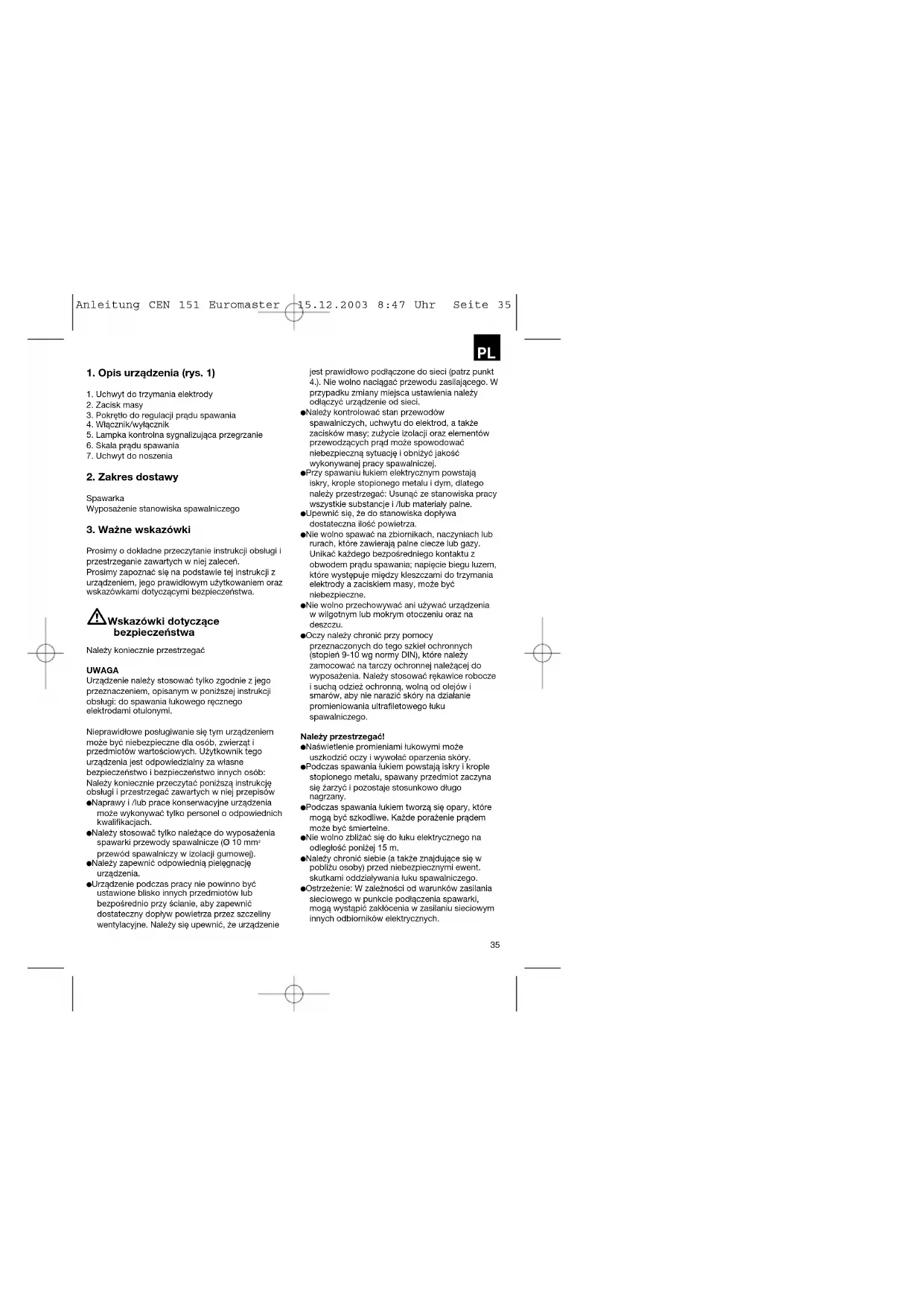 Anleitung CEN 151 Euromaster 15.12.2003 8:47 Uhr Seite 36Ciasne i wilgotne pomieszczenia Podczas pracy w wąskich, wilgotnych lub gorących pomieszczeniach należy stosować maty izolacyjne układane na podłodze i przy ścianach, a ponadto długie rękawice skórzane lub inne źle przewodzące materiały w celu odizolowania ciała od podłogi, ścian i łatwo przewodzących prąd części aparatu itp. W przypadku stosowania małych transformatorów spawalniczych do spawania w warunkach o podwyższonym zagrożeniu porażeniem elektrycznym, jak np. w ciasnych pomieszczeniach wykonanych z łatwo przewodzących ścianek (kotły, rury), w mokrych pomieszczeniach (przemoczenie odzieży roboczej), w gorących pomieszczeniach (przepocenie odzieży roboczej), napięcie wyjściowe spawarki na biegu luzem nie może przekraczać 42 V (wartość czynna). A zatem w tym przypadku nie wolno stosować urządzenia ze względu na wyższe napięcie wyjściowe. Odzież ochronna