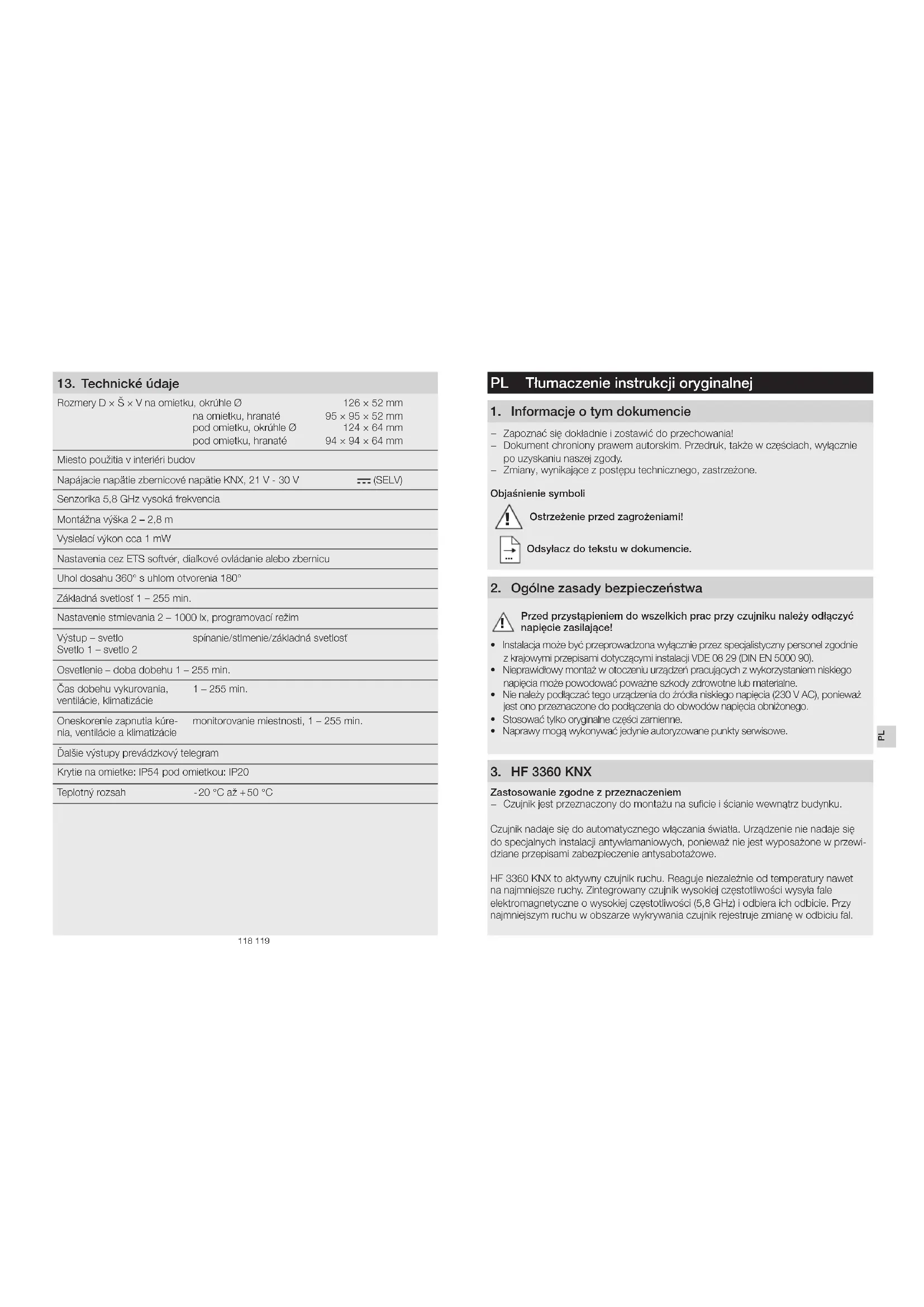 GWARANCJI LATA PRODUCENTA GWARANCJI LAT PRODUCENTA PL125124 12 Usterki Usterka Przyczyna Usuwanie brak napięcia zasilającego czujnik n przerwany przewód n sprawdzić zasilanie napięciem KNX czujnik nie włącza się n uszkodzona żarówka n przy dziennym trybie pracy ustawiono próg czułości zmierzcho- wej dla nocnego try- bu pracy n wymienić żarówkę n ustawić na nowo czujnik nie wyłącza się n w obszarze wykrywania czujnika ciągle się coś porusza n sprawdzić obszar wykrywania czujnik stale włącza się i wyłącza n w obszarze wykrywa- nia czujnika porusza się firana, kwiatek itp. i na skutek ruchu uaktywnia na nowo czujnik n sprawdzić obszar wykrywania czujnik włącza się wniepo- żądanym momencie n czujnik znajduje się w pobliżu WLAN lub in- nych źródeł fali radio- wych n zainstalować w odle- głości min. 2 m od źró- dła fal radiowych Wymiary (dł. x szer. x wys.) montaż natynkowy wersja okrągła Ø montaż natynkowy wersja prostokątna montaż podtynkowy wersja okrągła Ø montaż podtynkowy wersja prostokątna 126×52mm 95× 95×52mm 124×64mm 94× 94×64mm Miejsce zastosowania Wewnątrz budynków Napięcie zasilające Napięcie magistrali KNX, 21 V - 30 V (SELV) Technika sensorowa wysokiej częstotliwości 5,8 GHz Wysokość montażu 2 - 2,8m Moc nadawcza ok. 1mW Ustawienia za pomocą oprogramowania ETS, pilota zdalnego sterowania lub magistrali Kąt wykrywania 360° z kątem rozwarcia 180° Jasność podstawowa 1 - 255 min Ustawianie czułości zmierzchowej