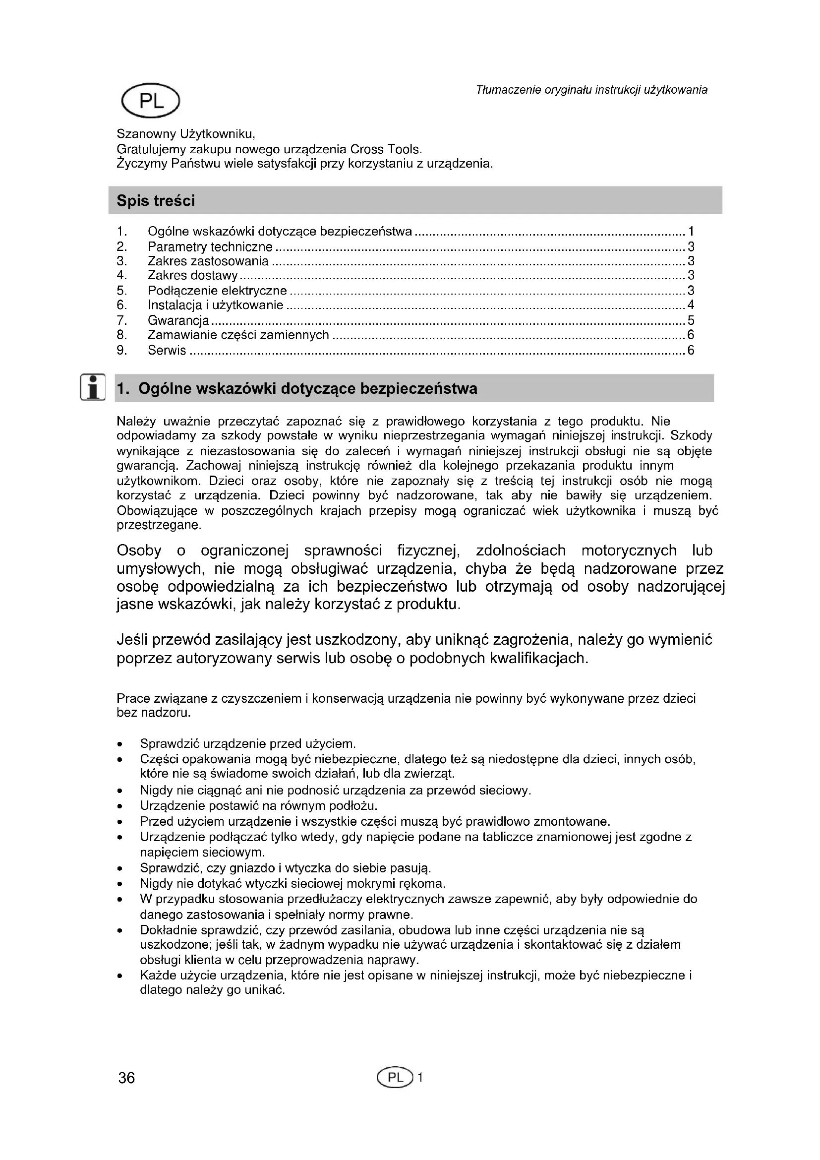 Należy uważnie przeczytać zapoznać się z prawidłowego korzystania z tego produktu. Nie odpowiadamy za szkody powstałe w wyniku nieprzestrzegania wymagań niniejszej instrukcji. Szkody wynikające z niezastosowania się do zaleceń i wymagań niniejszej instrukcji obsługi nie są objęte gwarancją. Zachowaj niniejszą instrukcję również dla kolejnego przekazania produktu innym użytkownikom. Dzieci oraz osoby, które nie zapoznały się z treścią tej instrukcji osób nie mogą korzystać z urządzenia. Dzieci powinny być nadzorowane, tak aby nie bawiły się urządzeniem. Obowiązujące w poszczególnych krajach przepisy mogą ograniczać wiek użytkownika i muszą być przestrzegane. Osoby o ograniczonej sprawności fizycznej, zdolnościach motorycznych lub umysłowych, nie mogą obsługiwać urządzenia, chyba że będą nadzorowane przez osobę odpowiedzialną za ich bezpieczeństwo lub otrzymają od osoby nadzorującej jasne wskazówki, jak należy korzystać z produktu. Jeśli przewód zasilający jest uszkodzony, aby uniknąć zagrożenia, należy go wymienić poprzez autoryzowany serwis lub osobę o podobnych kwalifikacjach.