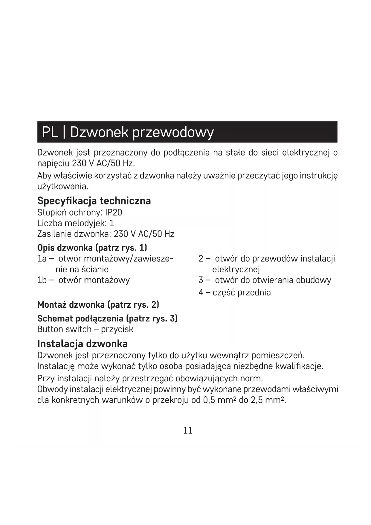 - Pre čistenie použite jemne navlhčenú handričku s trochou saponátu, nepoužívajte agresívne čistiace prostriedky alebo rozpúšťadlá. Tento prístroj nie je určený pre používanie osobami (vrátane detí), ktorým fyzická, zmyslová alebo mentálna neschopnosť či nedostatok skúseností a znalostí zabraňuje v bezpečnom používaní prístroja, pokiaľ na ne nebude dohliadané alebo pokiaľ neboli inštruované ohľadne použitia tohoto prístroja osobou zodpovednou za ich bezpečnosť. Je nutný dohľad nad deťmi, aby sa zaistilo, že sa nebudú s prístrojom hrať.11 PL | Dzwonek przewodowy Dzwonek jest przeznaczony do podłączenia na stałe do sieci elektrycznej o napięciu 230 V AC/50 Hz. Aby właściwie korzystać z dzwonka należy uważnie przeczytać jego instrukcję użytkowania. Specykacja techniczna Stopień ochrony: IP20 Liczba melodyjek: 1 Zasilanie dzwonka: 230 V AC/50 Hz Opis dzwonka (patrz rys. 1) 1a – otwór montażowy/zawiesze- nie na ścianie 1b – otwór montażowy 2 – otwór do przewodów instalacji elektrycznej 3 – otwór do otwierania obudowy 4 – część przednia Montaż dzwonka (patrz rys. 2) Schemat podłączenia (patrz rys. 3) Button switch – przycisk Instalacja dzwonka Dzwonek jest przeznaczony tylko do użytku wewnątrz pomieszczeń. Instalację może wykonać tylko osoba posiadająca niezbędne kwalikacje. Przy instalacji należy przestrzegać obowiązujących norm. Obwody instalacji elektrycznej powinny być wykonane przewodami właściwymi dla konkretnych warunków o przekroju od 0,5 mm do 2,5 mm.12 Przewód fazowy instalacji elektrycznej musi być zabezpieczony przed zwarciem i przeciążeniem odpowiednim zabezpieczeniem albo bezpiecznikiem.