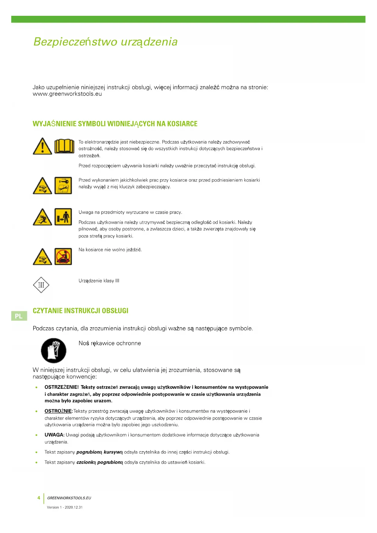 Version 1 - 2020.12.31 Materiały, dane techniczne i rysunki podane w niniejszym podręczniku mają charakter wyłącznie poglądowy i nie są wiążące. Producent zastrzega sobie prawo do wprowadzania zmian w zakresie parametrów technicznych i wszystkich funkcji użytkowych, materiałów, danych technicznych lub rysunków bez wcześniejszego powiadomienia. Na dalszych stronach podane są ważne instrukcje dotyczące bezpieczeństwa i obsługi. Prosimy uważnie przeczytać i przestudiować wszystkie zalecenia dotyczące bezpieczeństwa, ostrzeżenia i uwagi podane w niniejszym podręczniku. W przypadku nieprzeczytania lub nieprzestrzegania instrukcji, ostrzeżeń i uwag zawierających przestrogi, może dojść do ciężkich urazów ciała lub śmierci osób lub zwierząt domowych, bądź do zniszczenia własności prywatnej.GREENWORKSTOOLS.EU