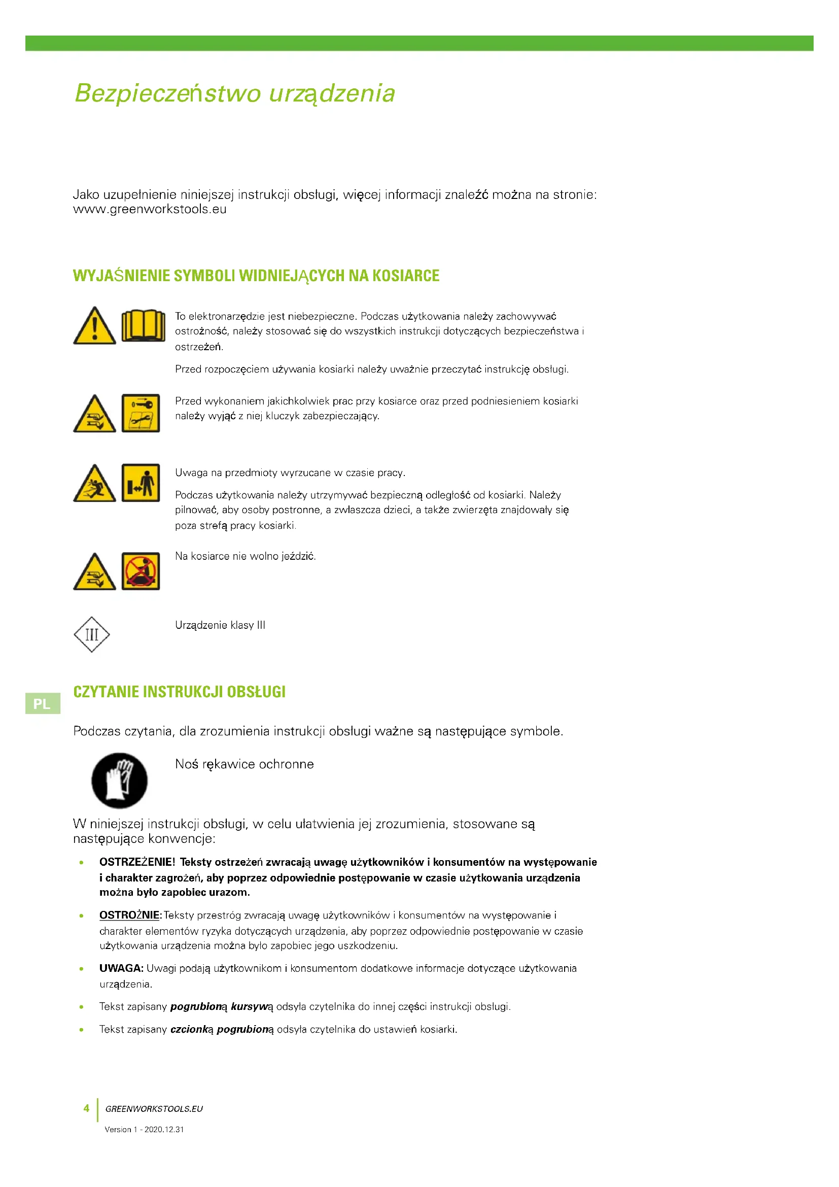 Version 1 - 2020.12.31 WYJAŚNIENIE SYMBOLI WIDNIEJĄCYCH NA KOSIARCE To elektronarzędzie jest niebezpieczne. Podczas użytkowania należy zachowywać ostrożność, należy stosować się do wszystkich instrukcji dotyczących bezpieczeństwa i ostrzeżeń. Przed rozpoczęciem używania kosiarki należy uważnie przeczytać instrukcję obsługi. Przed wykonaniem jakichkolwiek prac przy kosiarce oraz przed podniesieniem kosiarki należy wyjąć z niej kluczyk zabezpieczający. Uwaga na przedmioty wyrzucane w czasie pracy. Podczas użytkowania należy utrzymywać bezpieczną odległość od kosiarki. Należy pilnować, aby osoby postronne, a zwłaszcza dzieci, a także zwierzęta znajdowały się poza strefą pracy kosiarki. Na kosiarce nie wolno jeździć. Urządzenie klasy III Jako uzupełnienie niniejszej instrukcji obsługi, więcej informacji znaleźć można na stronie: www.greenworkstools.eu