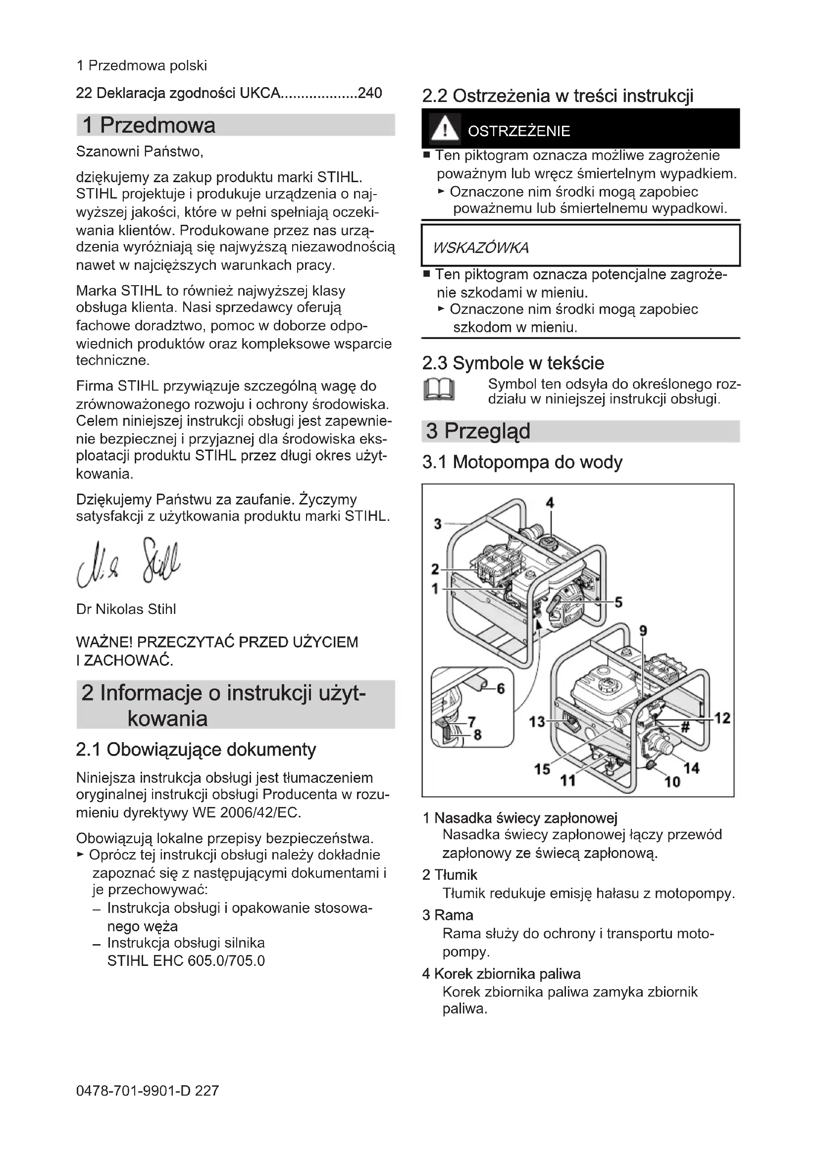- polski 22 Tuyên bố về sự phù hợp của UKCA 226 0478-701-9901-D © ANDREAS STIHL AG & Co. KG 2023 0478-701-9901-D. VA0.C23. Wydrukowano na papierze bielonym bez stosowania chloru. Papier nadaje się do recyklingu. Przekład oryginalnej instrukcji użytkowania 0000010020_014_PL22 Deklaracja zgodności UKCA 1 Przedmowa Szanowni Państwo, dziękujemy za zakup produktu marki STIHL. STIHL projektuje i produkuje urządzenia o naj‐ wyższej jakości, które w pełni spełniają oczeki‐ wania klientów. Produkowane przez nas urzą‐ dzenia wyróżniają się najwyższą niezawodnością nawet w najcięższych warunkach pracy. Marka STIHL to również najwyższej klasy obsługa klienta. Nasi sprzedawcy oferują fachowe doradztwo, pomoc w doborze odpo‐ wiednich produktów oraz kompleksowe wsparcie techniczne. Firma STIHL przywiązuje szczególną wagę do zrównoważonego rozwoju i ochrony środowiska. Celem niniejszej instrukcji obsługi jest zapewnie‐ nie bezpiecznej i przyjaznej dla środowiska eks‐ ploatacji produktu STIHL przez długi okres użyt‐ kowania. Dziękujemy Państwu za zaufanie. Życzymy satysfakcji z użytkowania produktu marki STIHL. Dr Nikolas Stihl p. 240