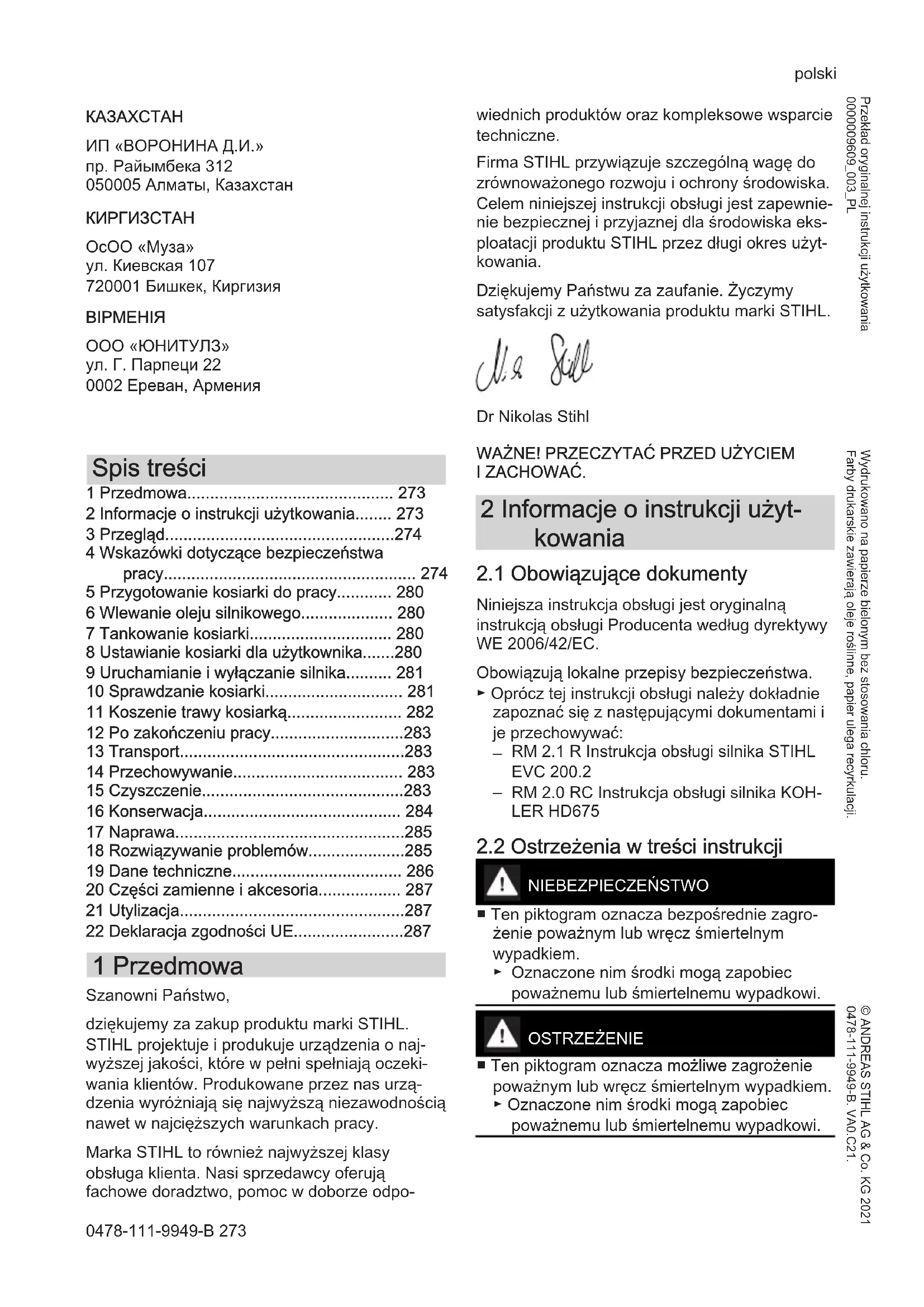 - 22 Deklaracja zgodności UE 1 Przedmowa Szanowni Państwo, dziękujemy za zakup produktu marki STIHL. STIHL projektuje i produkuje urządzenia o naj‐ wyższej jakości, które w pełni spełniają oczeki‐ wania klientów. Produkowane przez nas urzą‐ dzenia wyróżniają się najwyższą niezawodnością nawet w najcięższych warunkach pracy. Marka STIHL to również najwyższej klasy obsługa klienta. Nasi sprzedawcy oferują fachowe doradztwo, pomoc w doborze odpo‐ wiednich produktów oraz kompleksowe wsparcie techniczne. Firma STIHL przywiązuje szczególną wagę do zrównoważonego rozwoju i ochrony środowiska. Celem niniejszej instrukcji obsługi jest zapewnie‐ nie bezpiecznej i przyjaznej dla środowiska eks‐ ploatacji produktu STIHL przez długi okres użyt‐ kowania. Dziękujemy Państwu za zaufanie. Życzymy satysfakcji z użytkowania produktu marki STIHL. Dr Nikolas Stihl p. 287