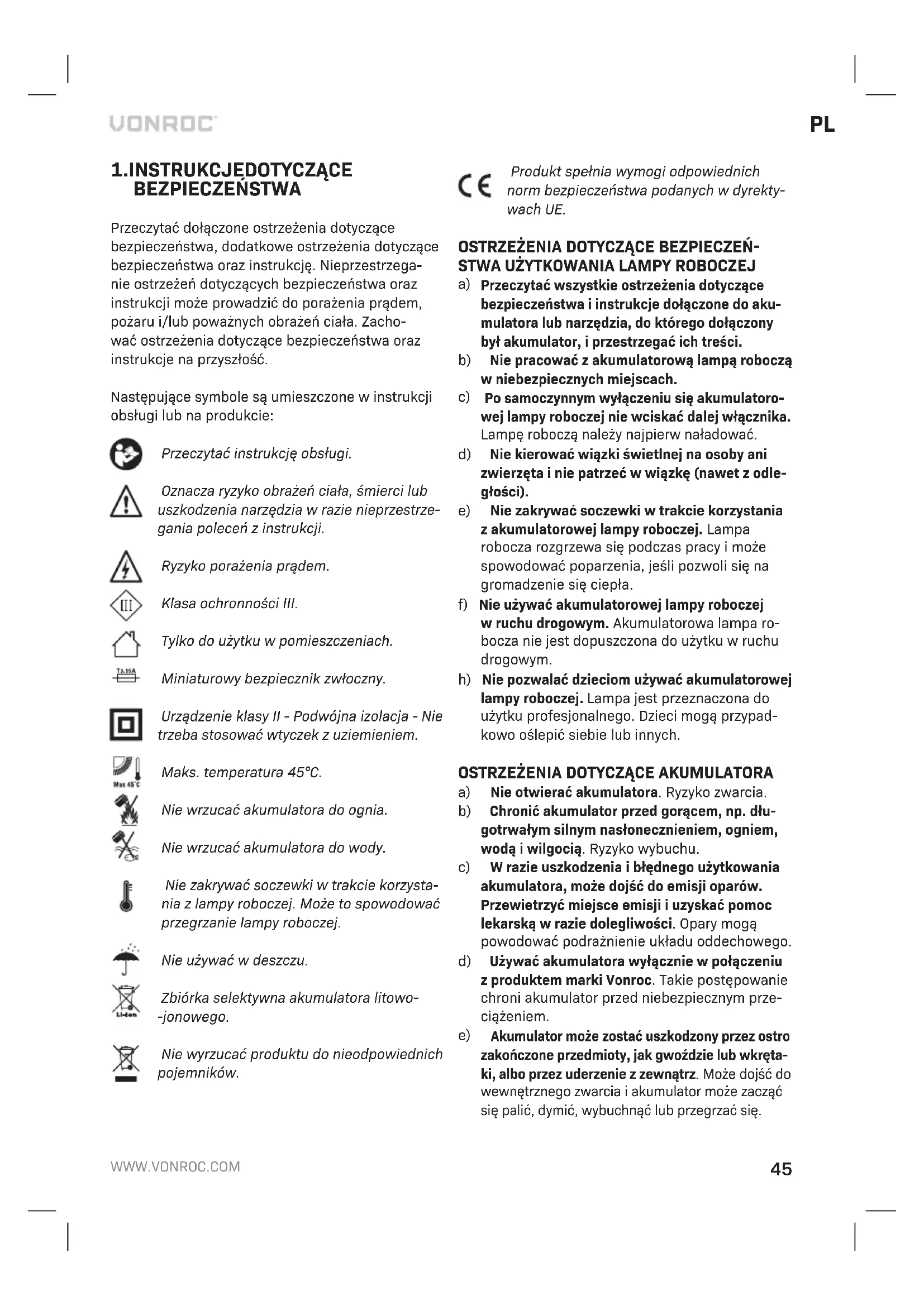 a) Nie otwierać akumulatora. Ryzyko zwarcia. b) Chronić akumulator przed gorącem, np. dłu- gotrwałym silnym nasłonecznieniem, ogniem, wodą iwilgocią. Ryzyko wybuchu. c) Wrazie uszkodzenia ibłędnego użytkowania akumulatora, może dojść do emisji oparów. Przewietrzyć miejsce emisji iuzyskać pomoc lekarską wrazie dolegliwości. Opary mogą powodować podrażnienie układu oddechowego. d) Używać akumulatora wyłącznie wpołączeniu zproduktem marki Vonroc. Takie postępowanie chroni akumulator przed niebezpiecznym prze- ciążeniem.