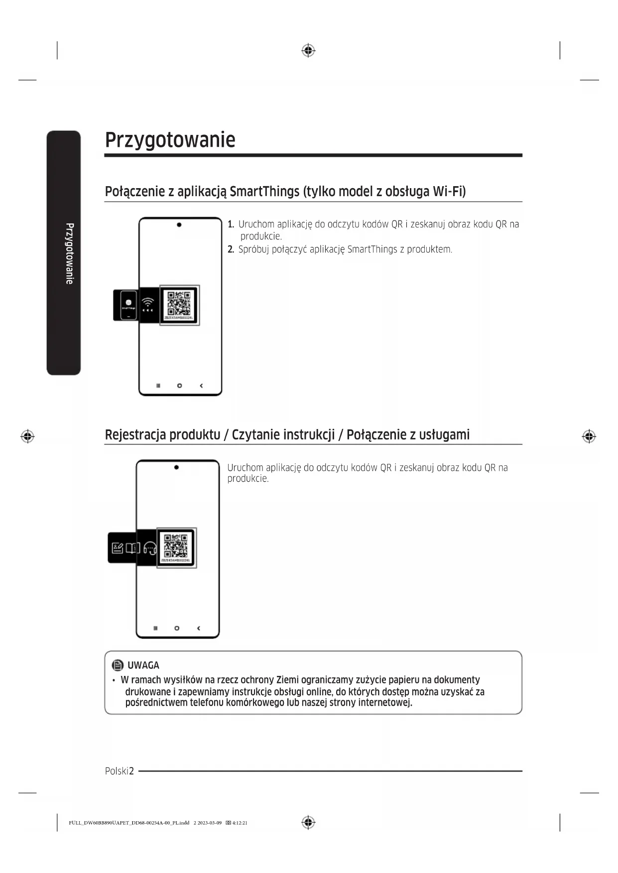 - (opłata według taryfy operatora) http://www.samsung.com/pl/support/ DD68-00254A-00 FULL_DW60BB890UAPET_DD68-00254A-00_NL.indd 76 2023-03-09 4:13:19Zmywarka do naczyń Instrukcja obsługi Seria DW60B*8***** / DW60B*7***** FULL_DW60BB890UAPET_DD68-00254A-00_PL.indd 1 2023-03-09 4:12:20Polski2 Przygotowanie Przygotowanie Połączenie z aplikacją SmartThings (tylko model z obsługa Wi-Fi)
