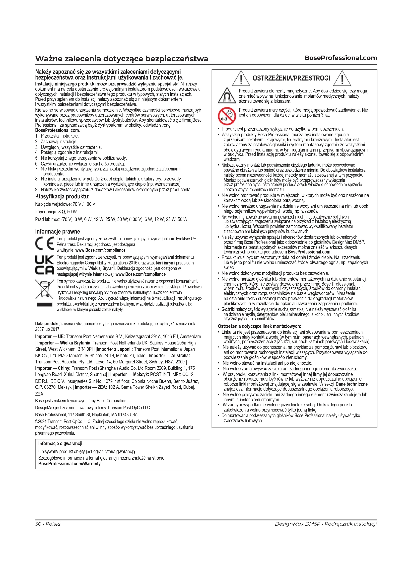 Informacje prawne Ten produkt jest zgodny ze wszystkimi obowiązującymi wymaganiami dyrektyw UE. Pełna treść Deklaracji zgodności jest dostępna w witrynie: www.Bose.com/compliance. Ten produkt jest zgodny ze wszystkimi obowiązującymi wymaganiami dokumentu Electromagnetic Compatibility Regulations 2016 oraz wszelkimi innymi przepisami obowiązującymi w Wielkiej Brytanii. Deklaracja zgodności jest dostępna w następującej witrynie internetowej: www.Bose.com/compliance Ten symbol oznacza, że produktu nie wolno utylizować razem z odpadami komunalnymi. Produkt należy dostarczyć do odpowiedniego miejsca zbiórki w celu recyklingu. Prawidłowa utylizacja i recykling ułatwiają ochronę zasobów naturalnych, ludzkiego zdrowia i środowiska naturalnego. Aby uzyskać więcej informacji na temat utylizacji i recyklingu tego produktu, skontaktuj się z samorządem lokalnym, w zakładzie utylizacji odpadów albo w sklepie, w którym produkt został nabyty. Data produkcji: ósma cyfra numeru seryjnego oznacza rok produkcji, np. cyfra „7” oznacza rok 2007 lub 2017. Importer — UE: Transom Post Netherlands B.V., Keizersgracht 391A, 1016 EJ, Amsterdam | Importer — Wielka Brytania: Transom Post Netherlands UK, Squires House 205a High Street, West Wickham, BR4 0PH |Importer z Japonii: Transom Post International Japan KK Co., Ltd. PMO Tamachi IV Shiba5-29-19, Minato-ku, Tokio | Importer — Australia: Transom Post Australia Pty. Ltd., Level 14, 60 Margaret Street, Sydney, NSW 2000 | Importer — Chiny: Transom Post (Shanghai) Audio Co. Ltd Room 2209, Building 1, 175 Longyao Road, Xuhui District, Shanghaj | Importer — Meksyk: POST INTL MEXICO, S. DE R.L. DE C.V. Insurgentes Sur No. 1079, 1st oor, Colonia Noche Buena, Benito Juárez, C.P. 03270, Meksyk | Importer — ZEA: 102 A, Sama Tower Sheikh Zayed Road, Dubaj, ZEA Bose jest znakiem towarowym rmy Bose Corporation. DesignMax jest znakiem towarowym rmy Transom Post OpCo LLC. Bose Professional, 117 South St, Hopkinton, MA 01748 USA ©2024 Transom Post OpCo LLC. Żadnej części tego dzieła nie wolno reprodukować, modykować, rozpowszechniać ani w inny sposób wykorzystywać bez uprzedniego uzyskania pisemnego pozwolenia. Informacje o gwarancji Opisywany produkt objęty jest ograniczoną gwarancją. Szczegółowe informacje na temat gwarancji można znaleźć na stronie BoseProfessional.com/Warranty. Klasykacja produktu: Napięcie wejściowe: 70 V / 100 V Impedancja: 8 Ω, 50 W Prąd lub moc: (70 V): 3 W, 6 W, 12 W, 25 W, 50 W; (100 V): 6 W, 12 W, 25 W, 50 W