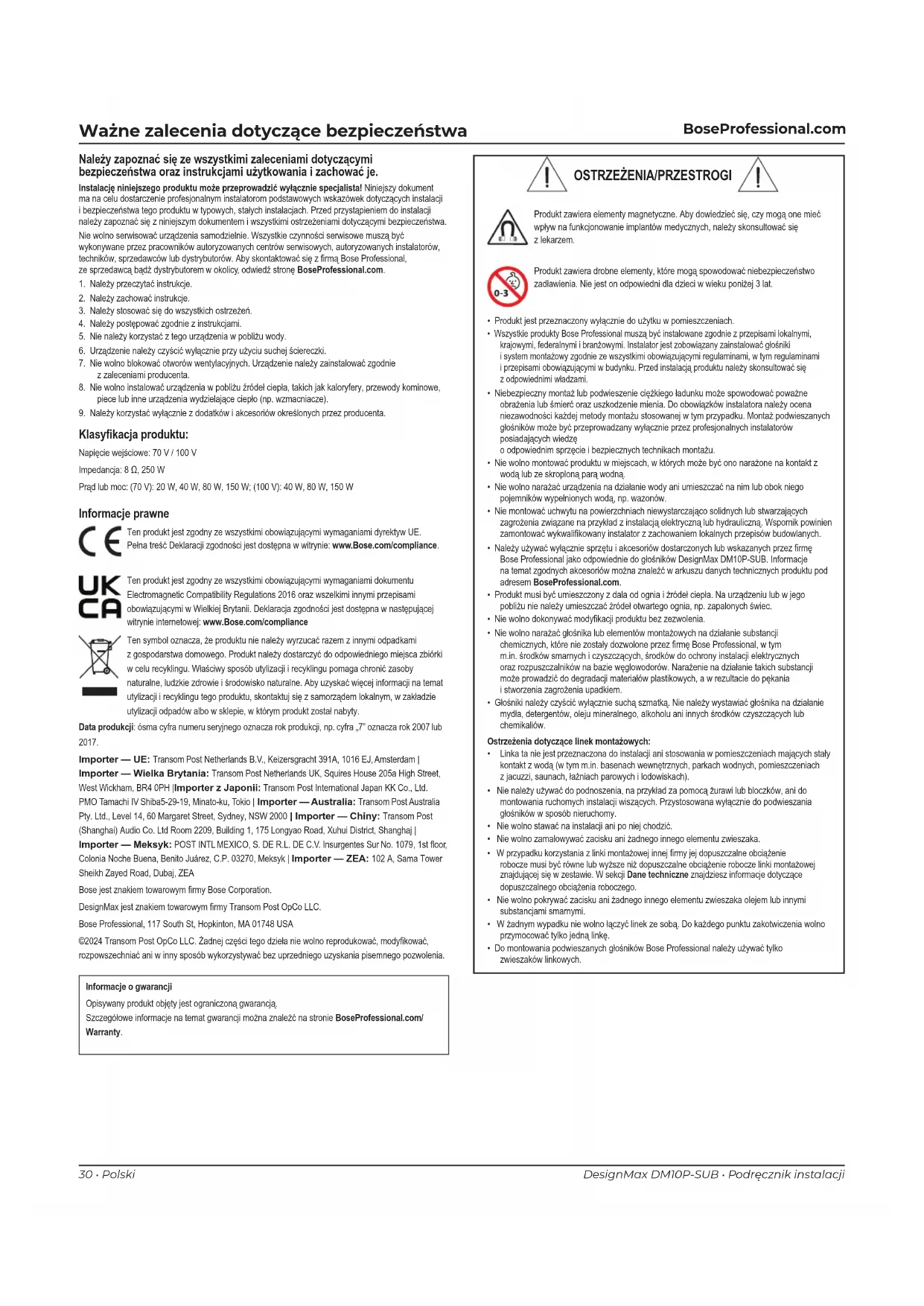 Importer — UE: Transom Post Netherlands B.V., Keizersgracht 391A, 1016 EJ, Amsterdam | Importer — Wielka Brytania: Transom Post Netherlands UK, Squires House 205a High Street, West Wickham, BR4 0PH |Importer z Japonii: Transom Post International Japan KK Co., Ltd. PMO Tamachi IV Shiba5-29-19, Minato-ku, Tokio | Importer — Australia: Transom Post Australia Pty. Ltd., Level 14, 60 Margaret Street, Sydney, NSW 2000 | Importer — Chiny: Transom Post (Shanghai) Audio Co. Ltd Room 2209, Building 1, 175 Longyao Road, Xuhui District, Shanghaj | Importer — Meksyk: POST INTL MEXICO, S. DE R.L. DE C.V. Insurgentes Sur No. 1079, 1st oor, Colonia Noche Buena, Benito Juárez, C.P. 03270, Meksyk | Importer — ZEA: 102 A, Sama Tower Sheikh Zayed Road, Dubaj, ZEA Bose jest znakiem towarowym rmy Bose Corporation. DesignMax jest znakiem towarowym rmy Transom Post OpCo LLC. Bose Professional, 117 South St, Hopkinton, MA 01748 USA ©2024 Transom Post OpCo LLC. Żadnej części tego dzieła nie wolno reprodukować, modykować, rozpowszechniać ani w inny sposób wykorzystywać bez uprzedniego uzyskania pisemnego pozwolenia. Informacje o gwarancji Opisywany produkt objęty jest ograniczoną gwarancją. Szczegółowe informacje na temat gwarancji można znaleźć na stronie BoseProfessional.com/ Warranty. Klasykacja produktu: Napięcie wejściowe: 70 V / 100 V Impedancja: 8 Ω, 250 W Prąd lub moc: (70 V): 20 W, 40 W, 80 W, 150 W; (100 V): 40 W, 80 W, 150 W