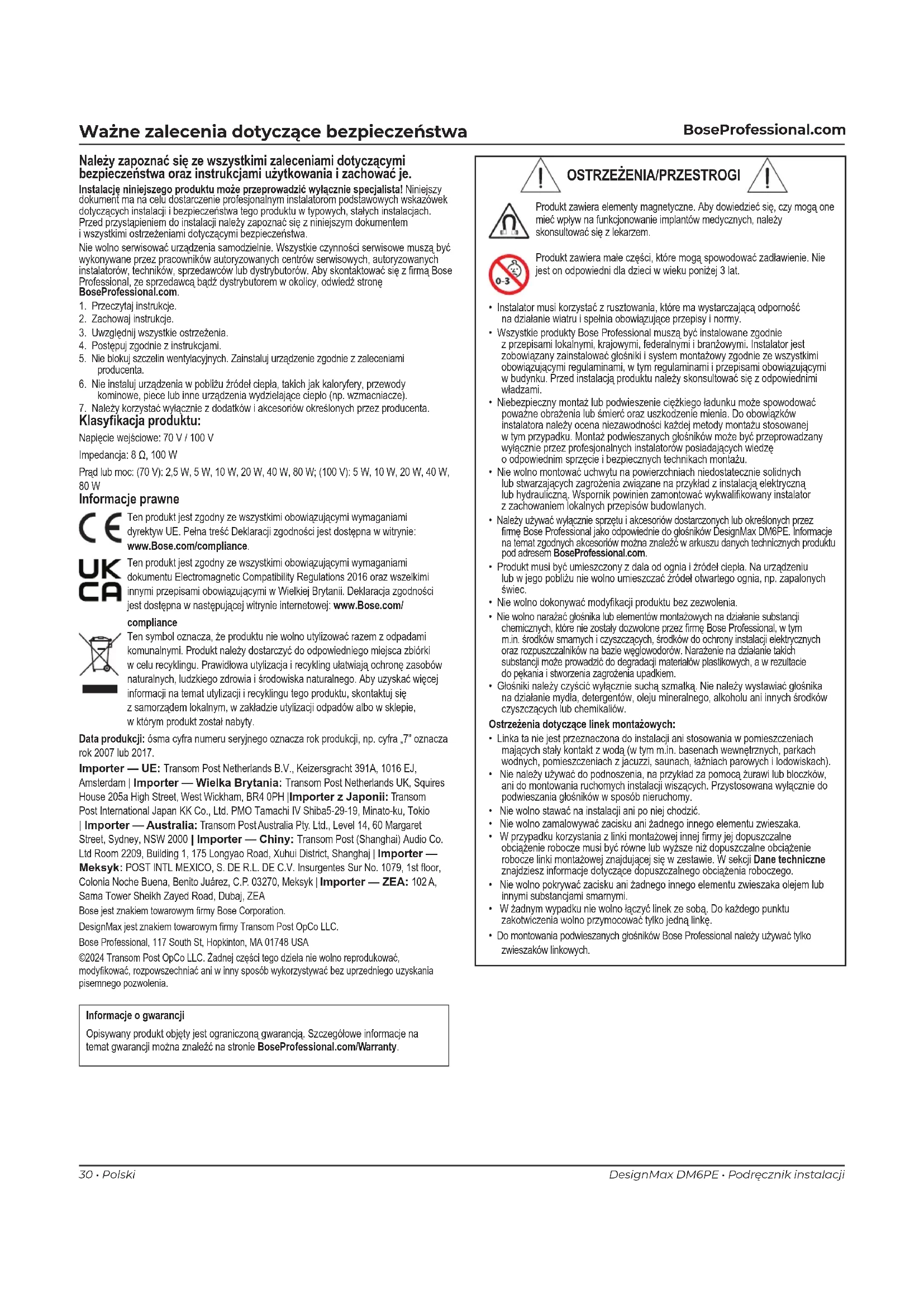 A B30 • Polski DesignMax DM6PE • Podręcznik instalacji BoseProfessional.com Ważne zalecenia dotyczące bezpieczeństwa Należy zapoznać się ze wszystkimi zaleceniami dotyczącymi bezpieczeństwa oraz instrukcjami użytkowania i zachować je. Instalację niniejszego produktu może przeprowadzić wyłącznie specjalista! Niniejszy dokument ma na celu dostarczenie profesjonalnym instalatorom podstawowych wskazówek dotyczących instalacji i bezpieczeństwa tego produktu w typowych, stałych instalacjach. Przed przystąpieniem do instalacji należy zapoznać się z niniejszym dokumentem i wszystkimi ostrzeżeniami dotyczącymi bezpieczeństwa. Nie wolno serwisować urządzenia samodzielnie. Wszystkie czynności serwisowe muszą być wykonywane przez pracowników autoryzowanych centrów serwisowych, autoryzowanych instalatorów, techników, sprzedawców lub dystrybutorów. Aby skontaktować się z rmą Bose Professional, ze sprzedawcą bądź dystrybutorem w okolicy, odwiedź stronę BoseProfessional.com.