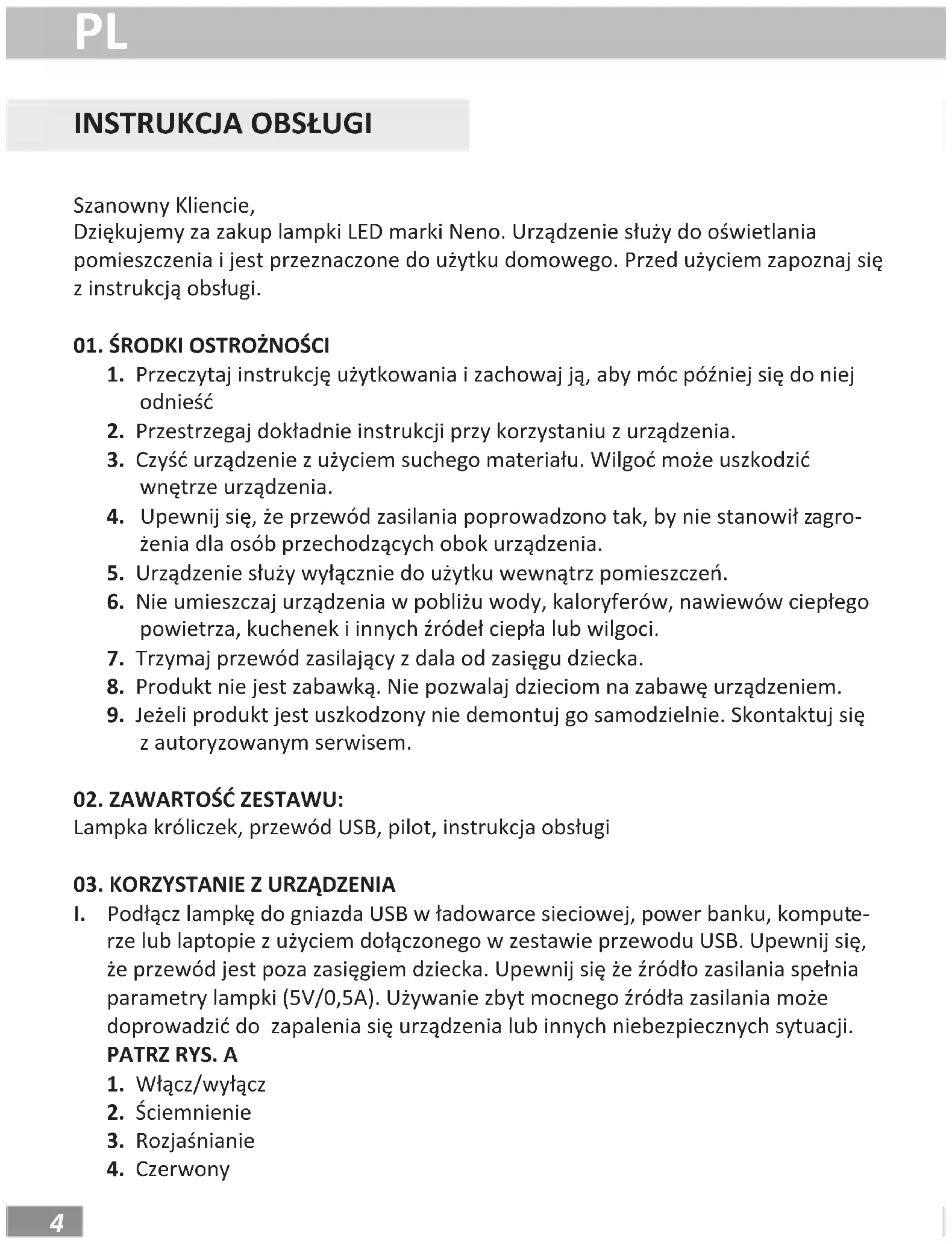 Szanowny Kliencie, Dziękujemy za zakup lampki LED marki Neno. Urządzenie służy do oświetlania pomieszczenia i jest przeznaczone do użytku domowego. Przed użyciem zapoznaj się z instrukcją obsługi.