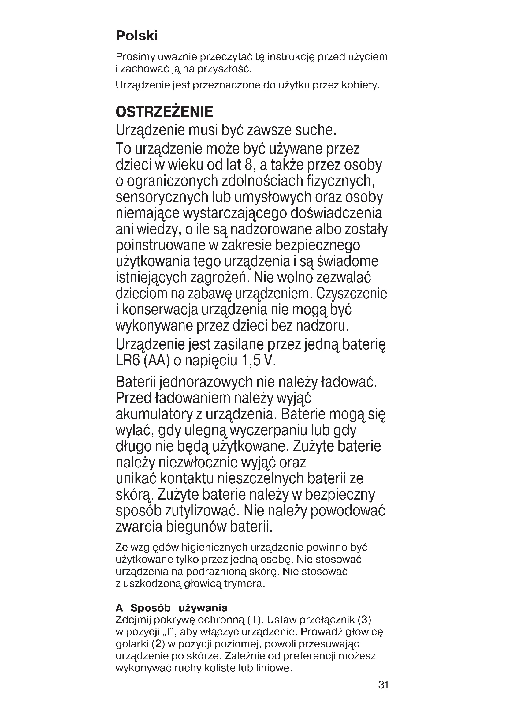 a) mechaniczne uszkodzenia sprzętu spowodowane w czasie jego użytkowania lub w czasie dostarczania sprzętu do naprawy; b) uszkodzenia i wady wynikłe na skutek: – używania sprzętu do celów innych niż osobisty użytek; – niewłaściwego lub niezgodnego z instrukcją użytkowania, konserwacji, przechowywania lub instalacji; – używania niewłaściwych materiałów eksploatacyjnych; – napraw dokonywanych przez nieuprawnione osoby; stwierdzenie faktu takiej naprawy lub samowolnego otwarcia sprzętu powoduje utratę gwarancji; – przeróbek, zmian konstrukcyjnych lub używania do napraw nieoryginalnych części zamiennych firmy Braun; – części szklane, żarówki oświetlenia; – ostrza i folie do golarek, wymienne końcówki do szczoteczek elektrycznych i irygatorów oraz materiały eksploatacyjne.