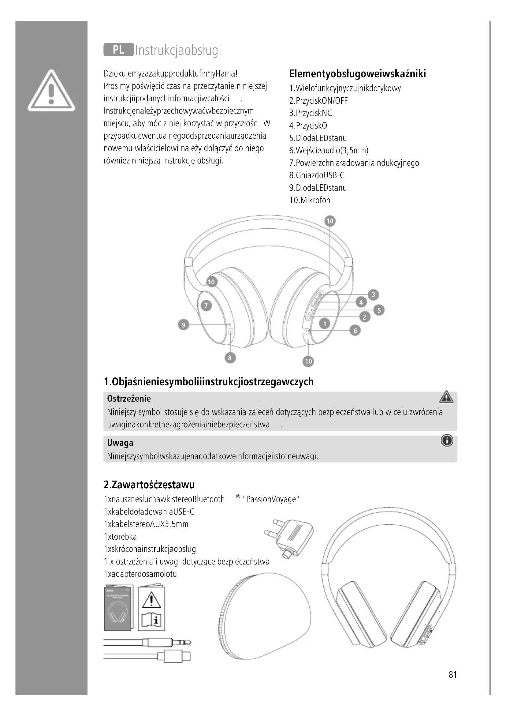 "Passion Voyage" 1 x kabel do ładowania USB-C 1 x kabel stereo AUX 3,5 mm 1 x torebka 1 x skrócona instrukcja obsługi 1 x ostrzeżenia i uwagi dotyczące bezpieczeństwa 1 x adapter do samolotu P Instrukcja obsługi Dziękujemy za zakup produktu rmy Hama! Prosimy poświęcić czas na przeczytanie niniejszej instrukcji i podanych informacji w całości