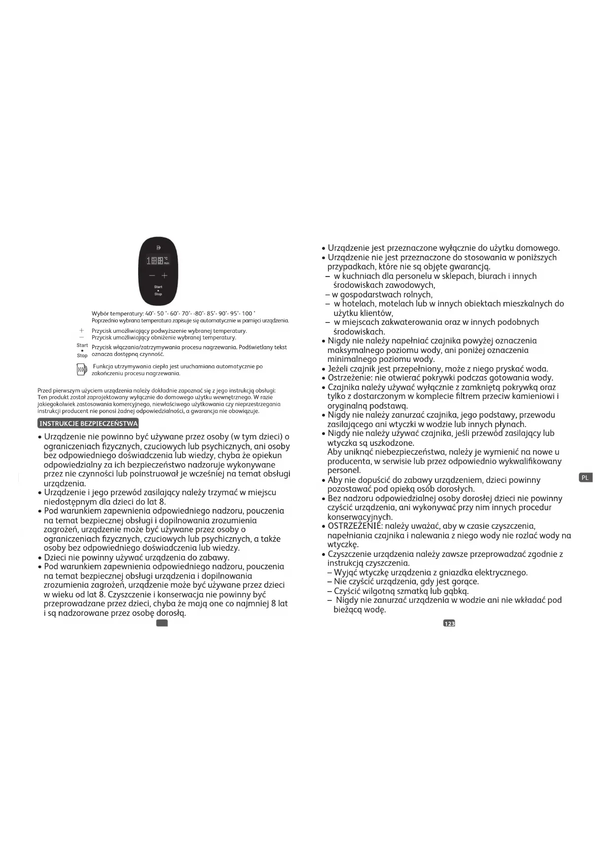 - Pod warunkiem zapewnienia odpowiedniego nadzoru, pouczenia na temat bezpiecznej obsługi urządzenia i dopilnowania zrozumienia zagrożeń, urządzenie może być używane przez dzieci w wieku od lat 8. Czyszczenie i konserwacja nie powinny być przeprowadzane przez dzieci, chyba że mają one co najmniej 8 lat i są nadzorowane przez osobę dorosłą. Funkcja utrzymywania ciepła jest uruchamiana automatycznie po zakończeniu procesu nagrzewania. Wybór temperatury: 40°- 50 °- 60°- 70°- -80°- 85°- 90°- 95°- 100 ° Poprzednio wybrana temperatura zapisuje się automatycznie w pamięci urządzenia. Przycisk umożliwiający podwyższenie wybranej temperatury. Przycisk umożliwiający obniżenie wybranej temperatury. Przycisk włączania/zatrzymywania procesu nagrzewania. Podświetlany tekst oznacza dostępną czynność.125124