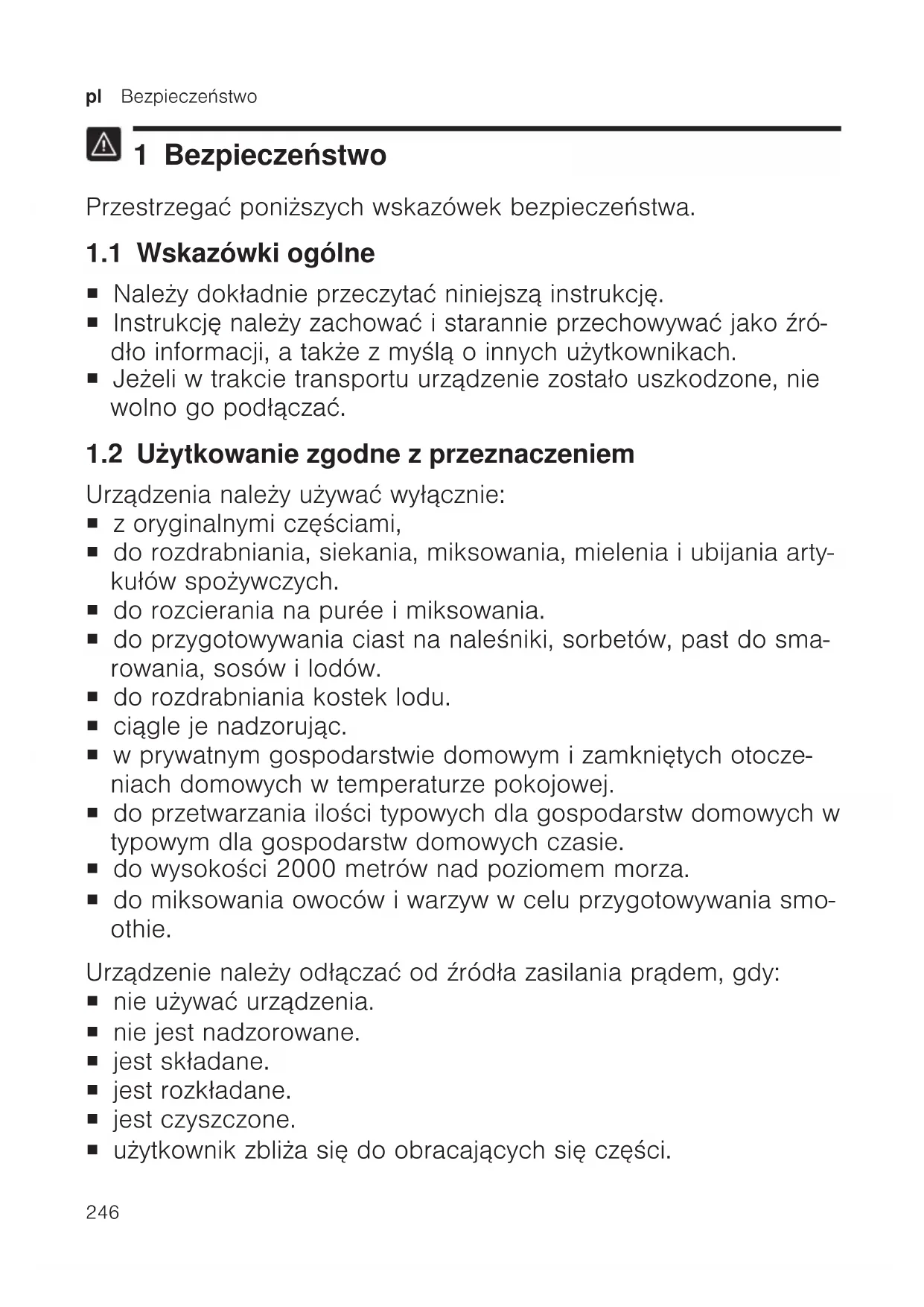1 Bezpieczeństwo Przestrzegać poniższych wskazówek bezpieczeństwa. 1.1 Wskazówki ogólne ¡ Należy dokładnie przeczytać niniejszą instrukcję. ¡ Instrukcję należy zachować i starannie przechowywać jako źró- dło informacji, a także z myślą o innych użytkownikach. ¡ Jeżeli w trakcie transportu urządzenie zostało uszkodzone, nie wolno go podłączać. 1.2 Użytkowanie zgodne zprzeznaczeniem Urządzenia należy używać wyłącznie: ¡ z oryginalnymi częściami, ¡ do rozdrabniania, siekania, miksowania, mielenia i ubijania arty- kułów spożywczych. ¡ do rozcierania napurée i miksowania. ¡ do przygotowywania ciast na naleśniki, sorbetów, past do sma- rowania, sosów i lodów. ¡ do rozdrabniania kostek lodu. ¡ ciągle je nadzorując. ¡ w prywatnym gospodarstwie domowym i zamkniętych otocze- niach domowych w temperaturze pokojowej. ¡ do przetwarzania ilości typowych dla gospodarstw domowych w typowym dla gospodarstw domowych czasie. ¡ do wysokości 2000 metrów nad poziomem morza. ¡ do miksowania owoców i warzyw w celu przygotowywania smo- othie. Urządzenie należy odłączać od źródła zasilania prądem, gdy: ¡ nie używać urządzenia. ¡ nie jest nadzorowane. ¡ jest składane. ¡ jest rozkładane. ¡ jest czyszczone. ¡ użytkownik zbliża się do obracających się części.Bezpieczeństwo pl