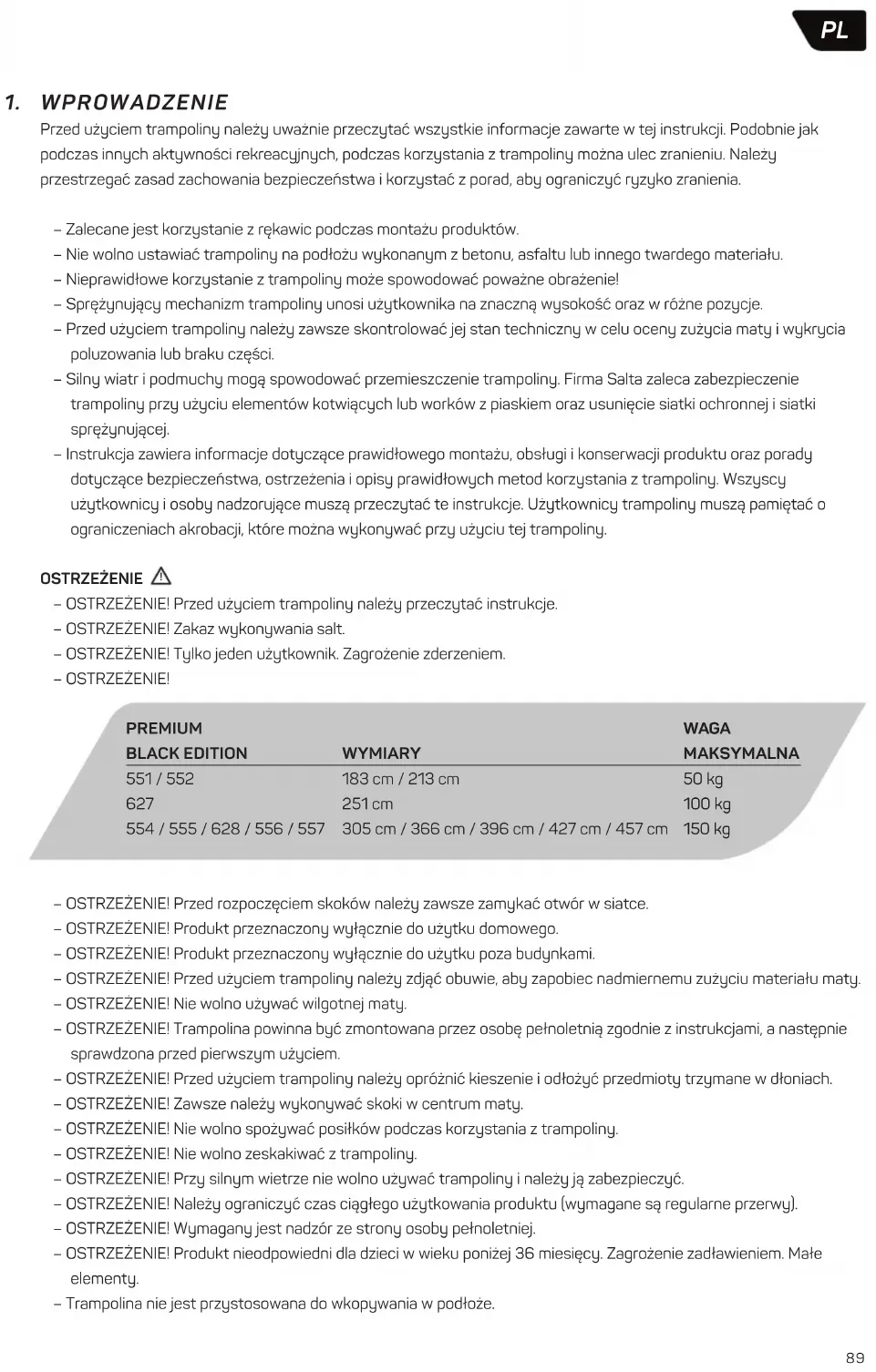 – OSTRZEŻENIE! Przed rozpoczęciem skoków należy zawsze zamykać otwór w siatce. – OSTRZEŻENIE! Produkt przeznaczony wyłącznie do użytku domowego. – OSTRZEŻENIE! Produkt przeznaczony wyłącznie do użytku poza budynkami. – OSTRZEŻENIE! Przed użyciem trampoliny należy zdjąć obuwie, aby zapobiec nadmiernemu zużyciu materiału maty. – OSTRZEŻENIE! Nie wolno używać wilgotnej maty. – OSTRZEŻENIE! Trampolina powinna być zmontowana przez osobę pełnoletnią zgodnie z instrukcjami, a następnie sprawdzona przed pierwszym użyciem. – OSTRZEŻENIE! Przed użyciem trampoliny należy opróżnić kieszenie i odłożyć przedmioty trzymane w dłoniach. – OSTRZEŻENIE! Zawsze należy wykonywać skoki w centrum maty. – OSTRZEŻENIE! Nie wolno spożywać posiłków podczas korzystania z trampoliny. – OSTRZEŻENIE! Nie wolno zeskakiwać z trampoliny. – OSTRZEŻENIE! Przy silnym wietrze nie wolno używać trampoliny i należy ją zabezpieczyć. – OSTRZEŻENIE! Należy ograniczyć czas ciągłego użytkowania produktu (wymagane są regularne przerwy). – OSTRZEŻENIE! Wymagany jest nadzór ze strony osoby pełnoletniej. – OSTRZEŻENIE! Produkt nieodpowiedni dla dzieci w wieku poniżej 36 miesięcy. Zagrożenie zadławieniem. Małe elementy. – Trampolina nie jest przystosowana do wkopywania w podłoże. PREMIUM BLACK EDITION 551 / 552