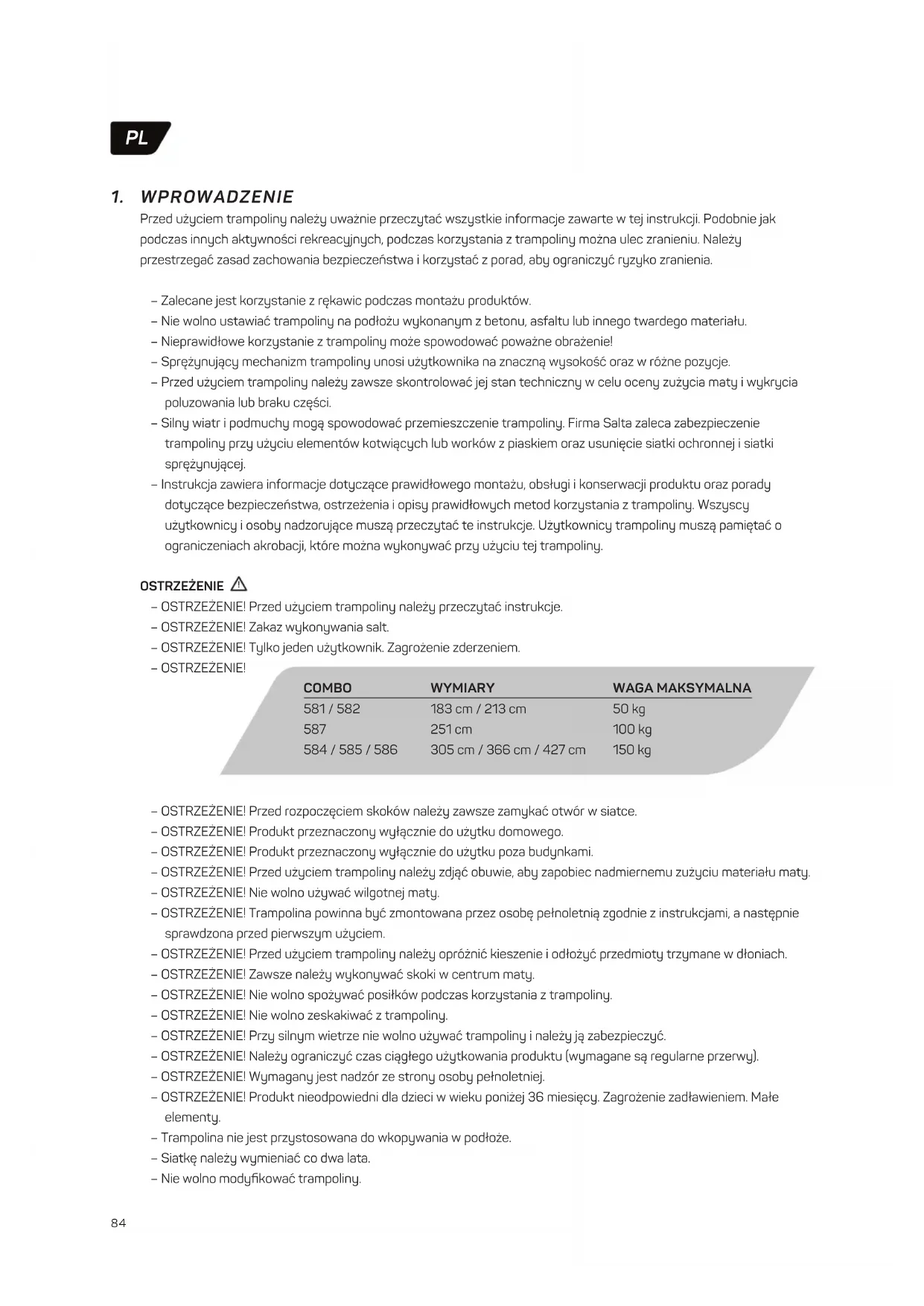 Przed użyciem trampoliny należy uważnie przeczytać wszystkie informacje zawarte w tej instrukcji. Podobnie jak podczas innych aktywności rekreacyjnych, podczas korzystania z trampoliny można ulec zranieniu. Należy przestrzegać zasad zachowania bezpieczeństwa i korzystać z porad, aby ograniczyć ryzyko zranienia. – Zalecane jest korzystanie z rękawic podczas montażu produktów. – Nie wolno ustawiać trampoliny na podłożu wykonanym z betonu, asfaltu lub innego twardego materiału. – Nieprawidłowe korzystanie z trampoliny może spowodować poważne obrażenie! – Sprężynujący mechanizm trampoliny unosi użytkownika na znaczną wysokość oraz w różne pozycje. – Przed użyciem trampoliny należy zawsze skontrolować jej stan techniczny w celu oceny zużycia maty i wykrycia poluzowania lub braku części. – Silny wiatr i podmuchy mogą spowodować przemieszczenie trampoliny. Firma Salta zaleca zabezpieczenie trampoliny przy użyciu elementów kotwiących lub worków z piaskiem oraz usunięcie siatki ochronnej i siatki sprężynującej. – Instrukcja zawiera informacje dotyczące prawidłowego montażu, obsługi i konserwacji produktu oraz porady dotyczące bezpieczeństwa, ostrzeżenia i opisy prawidłowych metod korzystania z trampoliny. Wszyscy użytkownicy i osoby nadzorujące muszą przeczytać te instrukcje. Użytkownicy trampoliny muszą pamiętać o ograniczeniach akrobacji, które można wykonywać przy użyciu tej trampoliny. OSTRZEŻENIE – OSTRZEŻENIE! Przed użyciem trampoliny należy przeczytać instrukcje. – OSTRZEŻENIE! Zakaz wykonywania salt. – OSTRZEŻENIE! Tylko jeden użytkownik. Zagrożenie zderzeniem. – OSTRZEŻENIE!