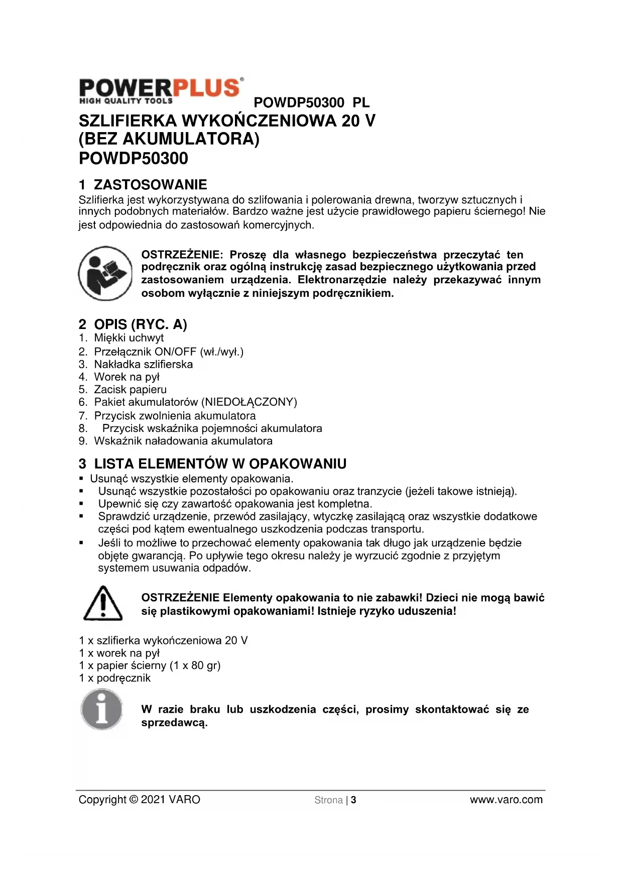 - Podczas utylizacji akumulatorów przestrzegać instrukcji zawartych w rozdziale „Ochrona środowiska”.POWDP50300 PL Copyright © 2021 VARO Strona | 7 www.varo.com