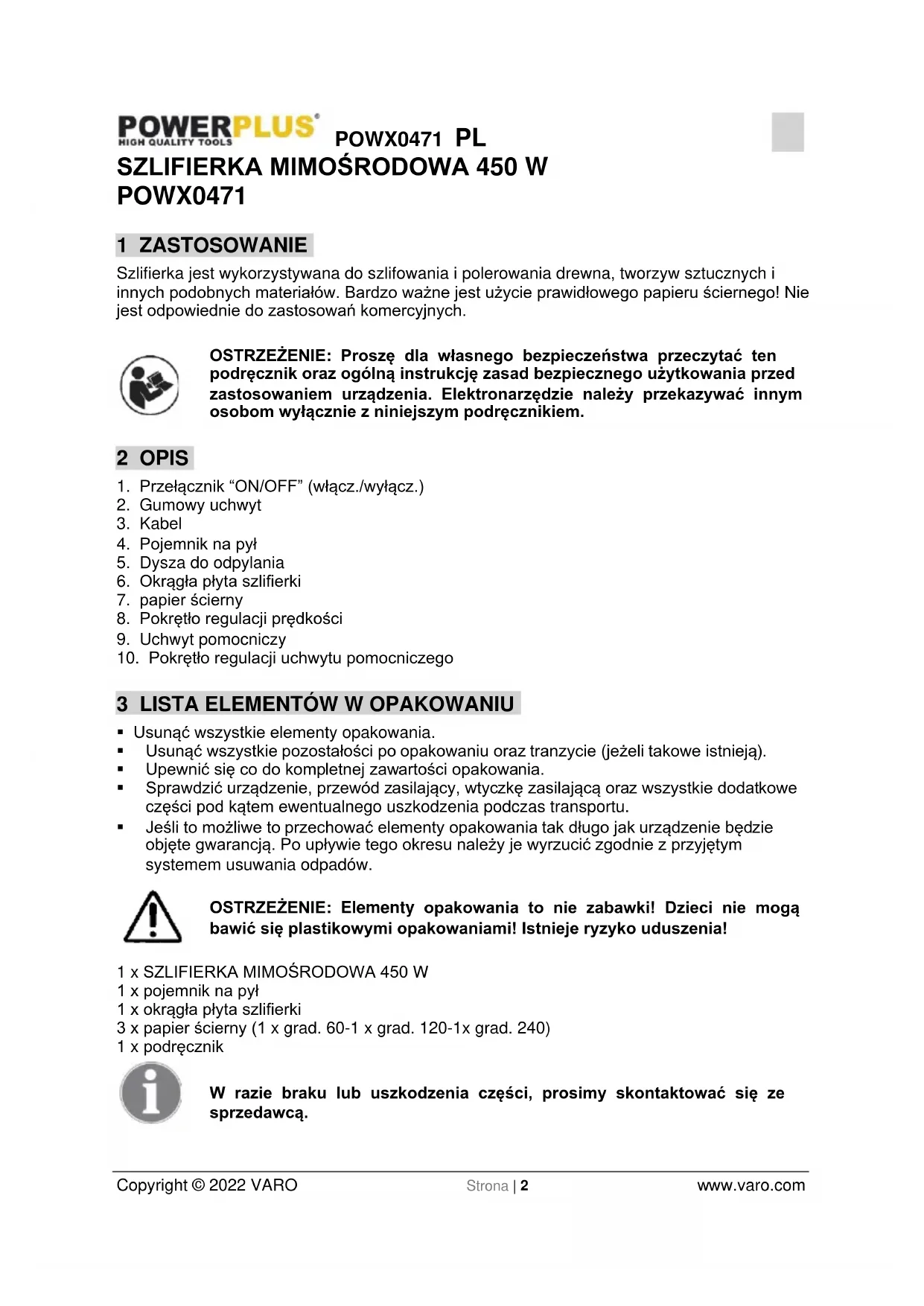- Jeśli to możliwe to przechować elementy opakowania tak długo jak urządzenie będzie objęte gwarancją. Po upływie tego okresu należy je wyrzucić zgodnie z przyjętym systemem usuwania odpadów. OSTRZEŻENIE: Elementy opakowania to nie zabawki! Dzieci nie mogą bawić się plastikowymi opakowaniami! Istnieje ryzyko uduszenia! 1 x SZLIFIERKA MIMOŚRODOWA 450 W 1 x pojemnik na pył 1 x okrągła płyta szlifierki 3 x papier ścierny (1 x grad. 60-1 x grad. 120-1x grad. 240) 1 x podręcznik W razie braku lub uszkodzenia części, prosimy skontaktować się ze sprzedawcą.POWX0471 PL Copyright © 2022 VARO Strona | 3 www.varo.com 4 SYMBOLE W niniejszej instrukcji i na urządzeniu zastosowano następujące symbole: