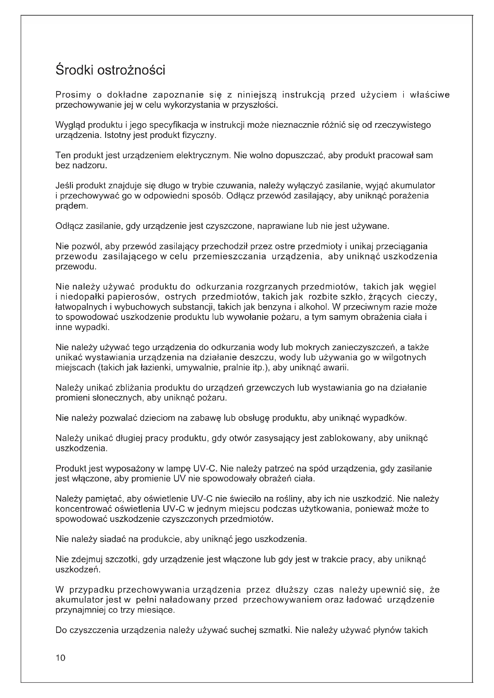 przycisk zwolnienia13 Tryb odkurzania Tryb zasilania Wskaźnik zablokowania szczotki Tryb naciskowy Wskaźnik jonów ujemnych Wskaźnik poziomu naładowania akumulatora Wskaźnik poziomu zanieczyszczenia Model UV Opis funkcji Tryb Vacuum+Tap+UV Po włączeniu zasilania, odkurzacz uruchomi tryb Vacuum +Tap +UV domyślnie. Moc produktu jest ustawiona na tryb normalny, odpowiedni wskaźnik będzie się świecił, a urządzenie rozpocznie funkcję odkurzania, usuwania roztoczy za pomocą UV-C i funkcję jonów ujemnych. Tryb Vacuum+UV Jeśli produkt znajduje się w trybie Vacuum+Tap+UV, przytrzymaj przycisk trybu przez 3 sekundy, aby zmienić tryb na Vacuum+UV. Odpowiedni wskaźnik zaświeci się, a produkt rozpocznie odkurzanie, usuwanie kurzu za pomocą funkcji UV-C oraz funkcję jonów ujemnych. Po naciśnięciu przycisku trybu w tym trybie, produkt przełączy się na tryb Turbo. Wskaźnik poziomu zanieczyszczenia Jeśli czyszczona powierzchnia jest już czysta, wskaźnik poziomu zanieczyszczenia jest niebieski. Gdy oczyszczona powierzchnia jest lekko brudna, pasek poziomu kurzu jest pomarańczowy. Jeśli powierzchnia jest dalej zabrudzona, wskaźnik jest czerwony. W miarę zmniejszania się poziomu zanieczyszczeń wskaźnik powoli zmienia się z czerwonego na niebieski. Wskaźnik poziomu naładowania akumulatora Wskaźnik poziomu naładowania akumulatora jest podzielony na pięć części, z których każda reprezentuje 20% mocy. Jeśli moc wynosi 100% podczas procesu rozładowania, pięć ikon świeci na biało, a odpowiednie ikony są wyłączone dla każdego 20% zużycia mocy. Jeśli pozostało 10% mocy, ikony są czerwone, aby przypomnieć o ładowaniu. Podczas procesu ładowania czerwony wskaźnik zaświeci się i będzie migać, gdy poziom naładowania będzie wynosić ≤10%. Ikona będzie migać na biało, gdy moc będzie większa niż 10%. Gdy poziom Wskaźnik LED wyświetlacza będzie świecił na czerwono, gdy produkt będzie się ładował. Jeśli wskaźnik zasilania na wyświetlaczu LED zmieni kolor na biały, oznacza to, że odkurzacz został w pełni naładowany. Należy w porę wyciągnąć wtyczkę z gniazdka AC. Prawidłowa obsługa produktu14 osiągnie 20%, następna ikona będzie migać na biało. Gdy poziom osiągnie 40%, ikona będzie migać po każdych następnych 20%. Jeśli poziom naładowania akumulatora jest pełny, pięć ikon będzie świecić na biało. Wskaźnik zablokowania szczotki Ten wskaźnik miga, gdy wałek szczotki jest zablokowany. Czyszczenie i konserwacja Uwaga: