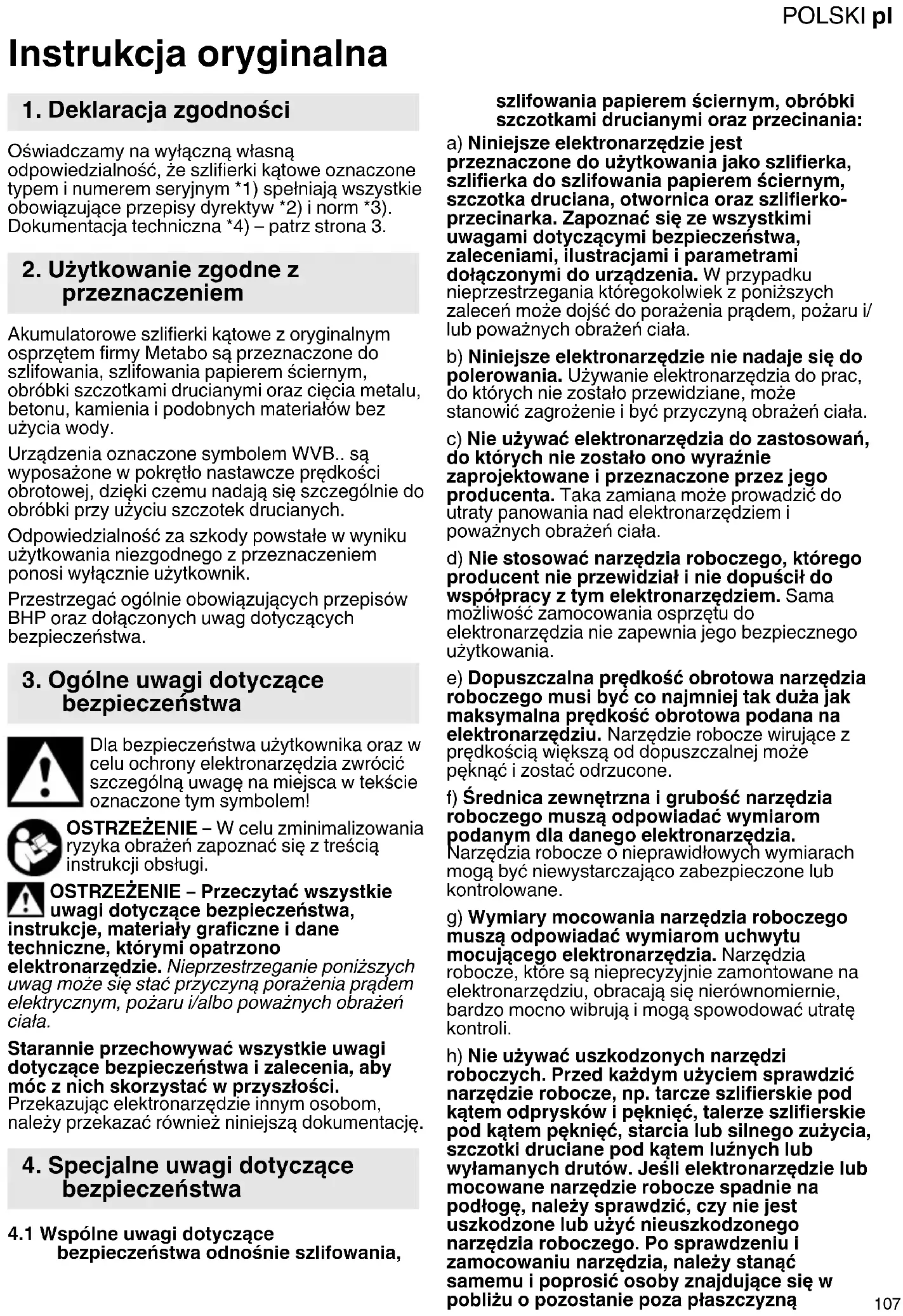 Instrukcja oryginalna Oświadczamy na wyłączną własną odpowiedzialność, że szlifierki kątowe oznaczone typem i numerem seryjnym *1) spełniają wszystkie obowiązujące przepisy dyrektyw *2) i norm *3). Dokumentacja techniczna *4) – patrz strona 3. Akumulatorowe szlifierki kątowe z oryginalnym osprzętem firmy Metabo są przeznaczone do szlifowania, szlifowania papierem ściernym, obróbki szczotkami drucianymi oraz cięcia metalu, betonu, kamienia i podobnych materiałów bez użycia wody. Urządzenia oznaczone symbolem WVB.. są wyposażone w pokrętło nastawcze prędkości obrotowej, dzięki czemu nadają się szczególnie do obróbki przy użyciu szczotek drucianych. Odpowiedzialność za szkody powstałe w wyniku użytkowania niezgodnego z przeznaczeniem ponosi wyłącznie użytkownik. Przestrzegać ogólnie obowiązujących przepisów BHP oraz dołączonych uwag dotyczących bezpieczeństwa. Dla bezpieczeństwa użytkownika oraz w celu ochrony elektronarzędzia zwrócić szczególną uwagę na miejsca w tekście oznaczone tym symbolem! OSTRZEŻENIE – W celu zminimalizowania ryzyka obrażeń zapoznać się z treścią instrukcji obsługi. OSTRZEŻENIE – Przeczytać wszystkie uwagi dotyczące bezpieczeństwa, instrukcje, materiały graficzne i dane techniczne, którymi opatrzono elektronarzędzie. Nieprzestrzeganie poniższych uwag może się stać przyczyną porażenia prądem elektrycznym, pożaru i/albo poważnych obrażeń ciała. Starannie przechowywać wszystkie uwagi dotyczące bezpieczeństwa i zalecenia, aby móc z nich skorzystać w przyszłości. Przekazując elektronarzędzie innym osobom, należy przekazać również niniejszą dokumentację.