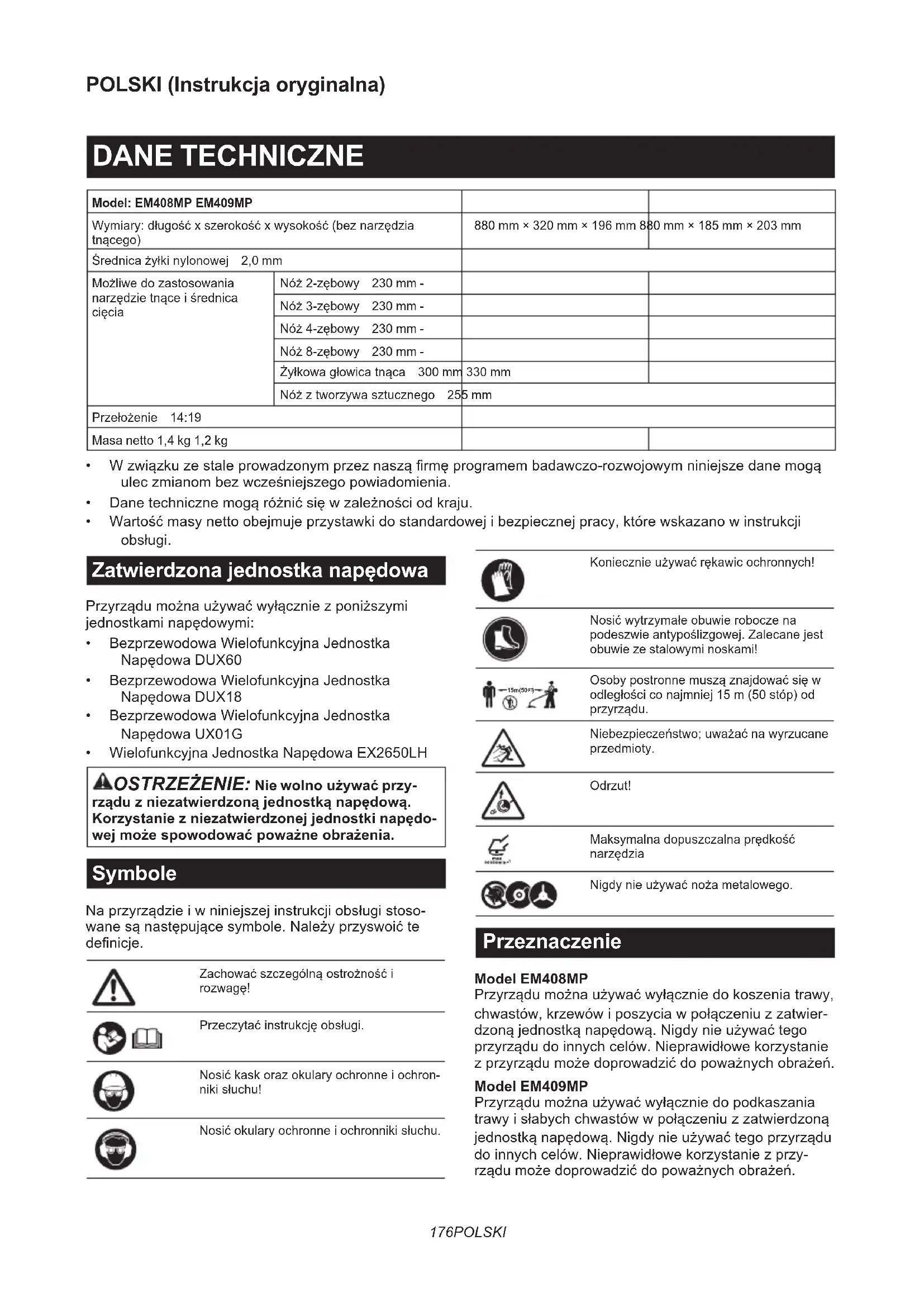 Osobypostronnemusząznajdowaćsięw odległościconajmniej15m(50stóp)od przyrządu. Niebezpieczeństwo;uważaćnawyrzucane przedmioty. Odrzut! Maksymalnadopuszczalnaprędkość narzędzia Nigdynieużywaćnożametalowego. Przeznaczenie Model EM408MP Przyrządumożnaużywaćwyłączniedokoszeniatrawy, chwastów,krzewówiposzyciawpołączeniuzzatwier- dzonąjednostkąnapędową.Nigdynieużywaćtego przyrządudoinnychcelów.Nieprawidłowekorzystanie zprzyrządumożedoprowadzićdopoważnychobrażeń. Model EM409MP Przyrządumożnaużywaćwyłączniedopodkaszania trawyisłabychchwastówwpołączeniuzzatwierdzoną jednostkąnapędową.Nigdynieużywaćtegoprzyrządu doinnychcelów.Nieprawidłowekorzystaniezprzy- rządumożedoprowadzićdopoważnychobrażeń.177 POLSKI OSTRZEŻENIE: Zaleca się przeczyta- nie instrukcji obsługi przyrządu, jak również niniejszej instrukcji przed użyciem urządzenia. Niezastosowaniesiędowspomnianychzasadi zaleceńmożeprzyczynićsiędopoważnychobrażeń ciała. Deklaracja zgodności UE Dotyczy tylko krajów europejskich Jako producenci: Makita Europe N.V.,adresrmy: Jan-Baptist Vinkstraat 2 3070 Kortenberg, BELGIA. UpoważniamyKazuhisa Makino do przygotowania dokumentacjitechnicznejinawłasnąodpowiedzialność oświadczamy,żeprodukty: Oznaczenie: Wykaszarka - Przystawka. Oznaczenie typu: EM408MP / EM409MP. Spełniająwszystkieodnośnepostanowieniadyrek- tywy 2006/42/WE,jakrównieżspełniająwszystkie odnośnepostanowienianastępującychdyrektywWE/ UE: 2000/14/WEisąprodukowanewsposóbzgodny znastępującyminormamizharmonizowanymi:EN ISO 11806-1:2022, EN 62841-1:2015+A11:2022. Miejsceidatadeklaracji:Kortenberg, Belgia. 1. 8.