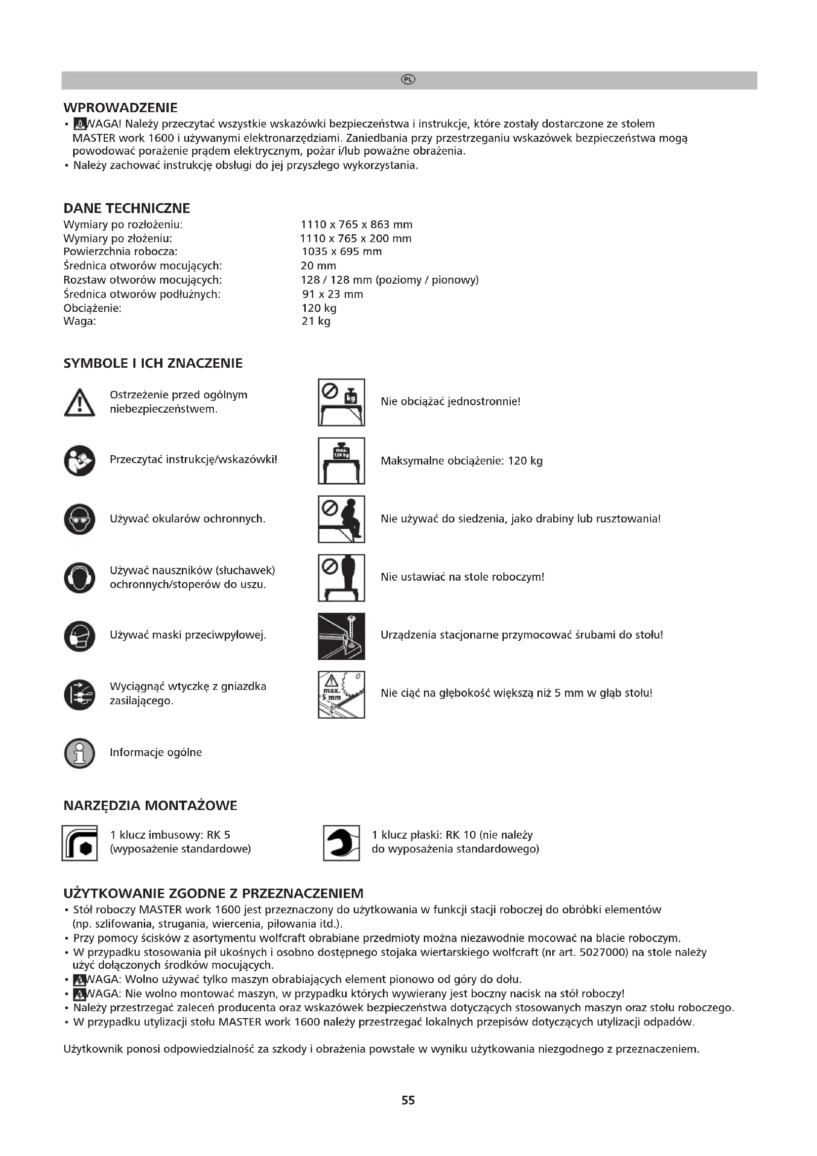 - W przypadku utylizacji stołu MASTER work 1600 należy przestrzegać lokalnych przepisów dotyczących utylizacji odpadów. Użytkownik ponosi odpowiedzialność za szkody i obrażenia powstałe w wyniku użytkowania niezgodnego z przeznaczeniem. 1 klucz płaski: RK 10 (nie należy do wyposażenia standardowego) BDAL 6909.000_143006909 04.02.20 11:28 Seite 55N