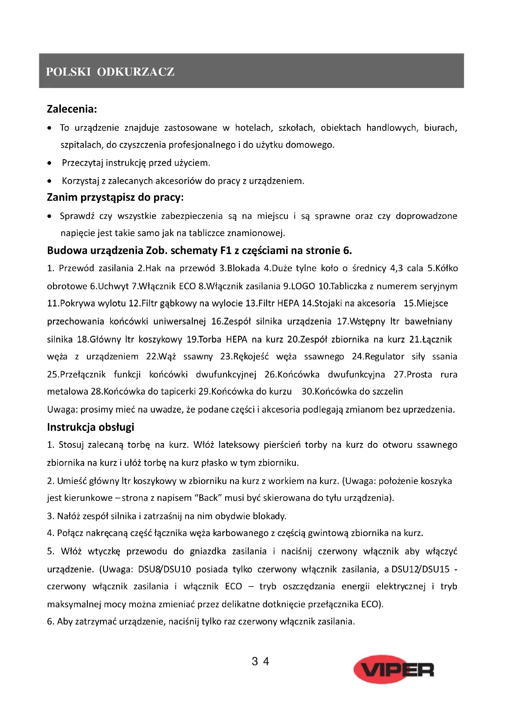 do odkurzania oraz końcówkę do tapicerki można wykorzystać do czyszczenia zasłon i mebli tapicerowanych. Gwarancja: Urządzenie zostało tak skonstruowane by zapewnić wieloletnią, bezusterkową pracę pod warunkiem prawidłowego serwisowania urządzenia. Na urządzenie obowiązuje 12-miesięczna gwarancja producenta na wypadek uszkodzenia komponentów. W przypadku ewentualnego wystąpienia awarii w urządzeniu VIPER, prosimy skontaktować się z dostawcą urządzenia lub najbliższym, autoryzowanym serwisem VIPER.