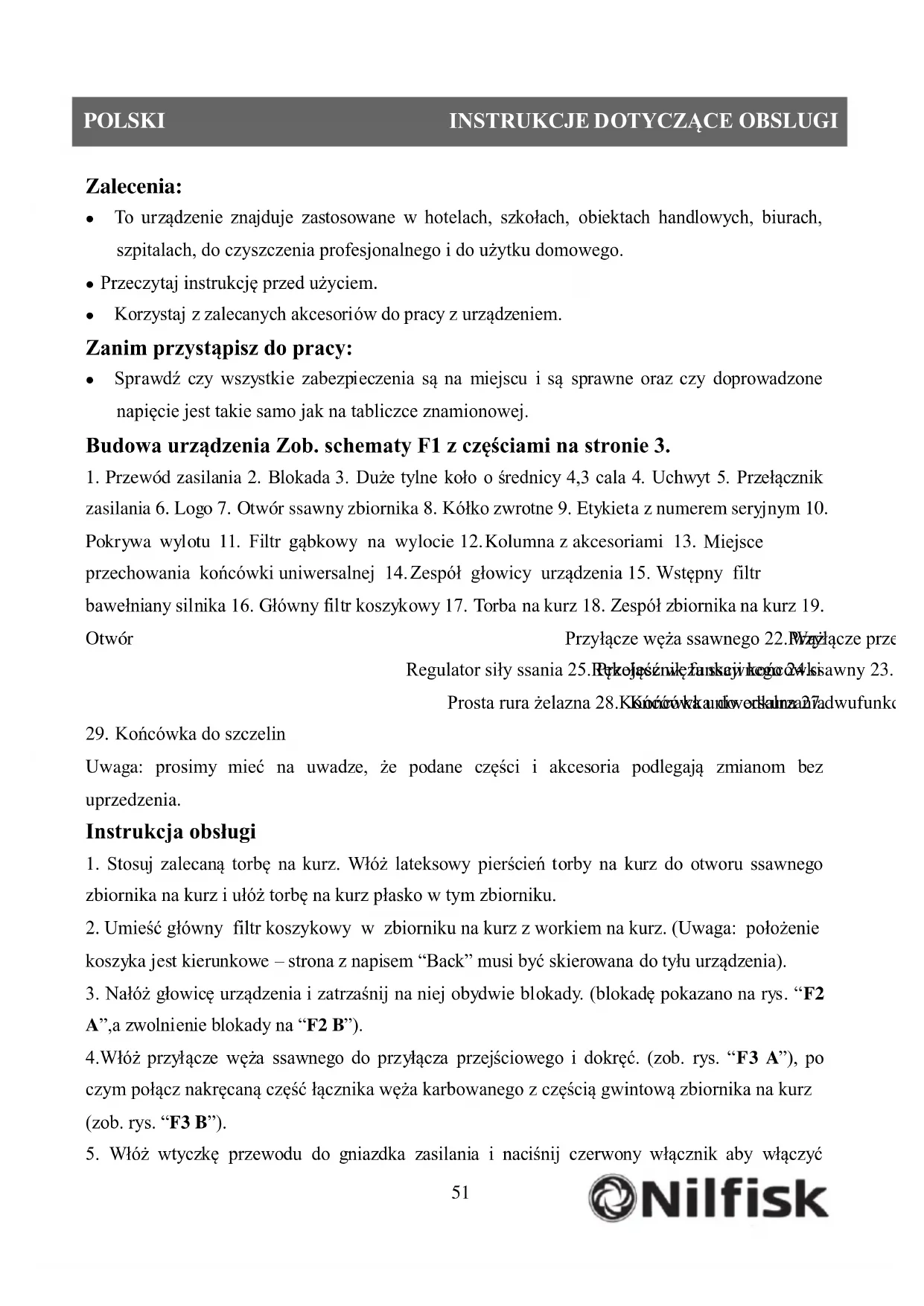 Zalecenia: To urządzenie znajduje zastosowane w hotelach, szkołach, obiektach handlowych, biurach, szpitalach, do czyszczenia profesjonalnego i do użytku domowego. Przeczytaj instrukcję przed użyciem. Korzystaj z zalecanych akcesoriów do pracy z urządzeniem. Zanim przystąpisz do pracy: Sprawdź czy wszystkie zabezpieczenia są na miejscu i są sprawne oraz czy doprowadzone napięcie jest takie samo jak na tabliczce znamionowej. Budowa urządzenia Zob. schematy F1 z częściami na stronie 3.