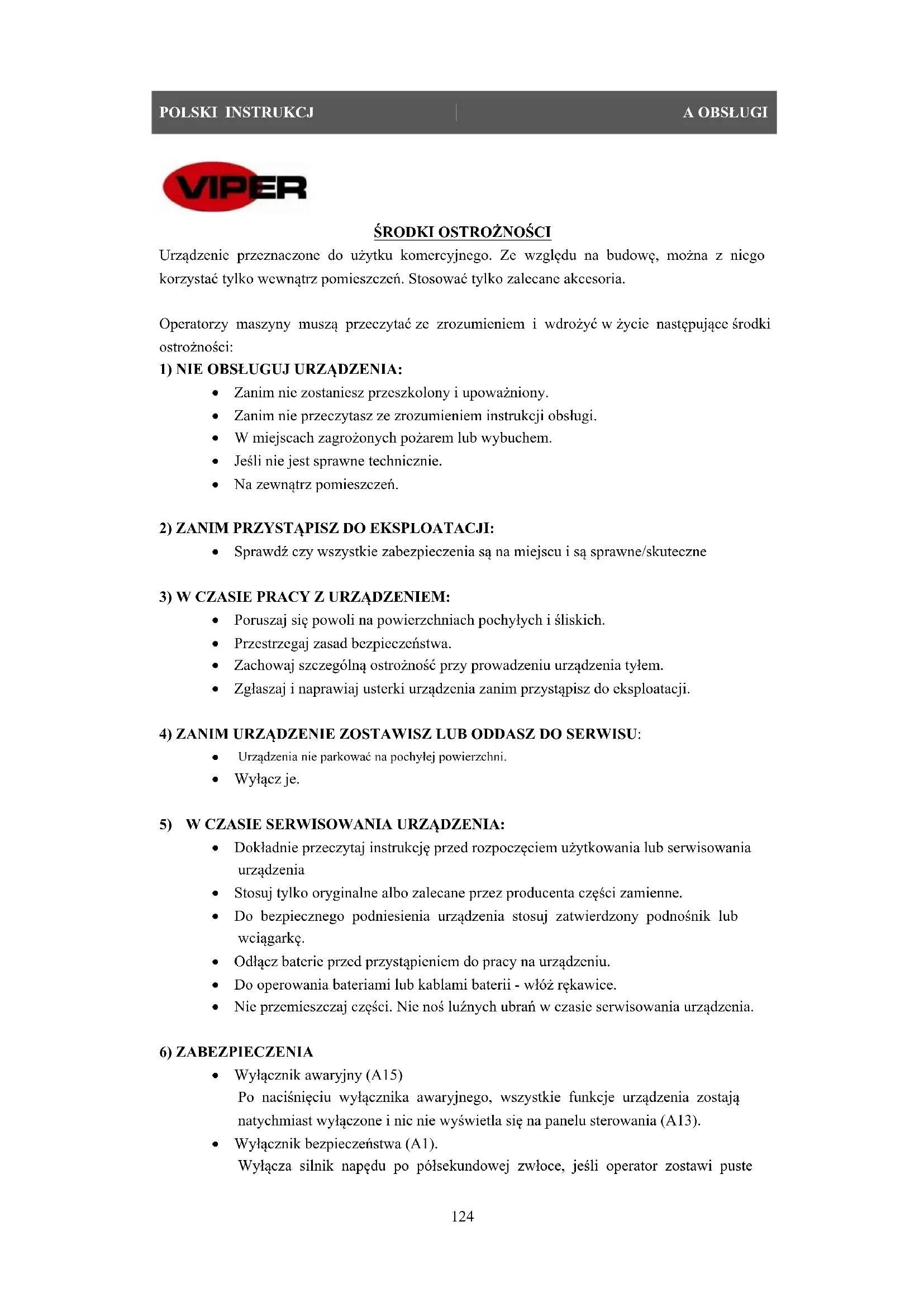 INFORMACJE O BŁĘDACH) Nachylenie w kierunku jazdy nie powinno przekraczać (10) %. Hamulec silnika napędowego jest aktywny w czasie normalnej pracy urządzenia, tzn. że wspornik hamulca znajduje się blisko korpusu silnika. Kiedy urządzenie jest pakowane/rozpakowywane, albo przy wystąpieniu błędu czy w innych specjalnych sytuacjach, wspornik hamulca jest wyciągnięty. W tej sytuacji użyj klinów hamujących, by móc przemieszczać urządzenie pchając je ręką. EKSPLOATAC JA MASZYNY Urządzenie wolno obsługiwać tylko po przejściu szkolenia zawodowego. Urządzenie uruchomić dopiero po przeczytaniu ze zrozumieniem tej instrukcji.