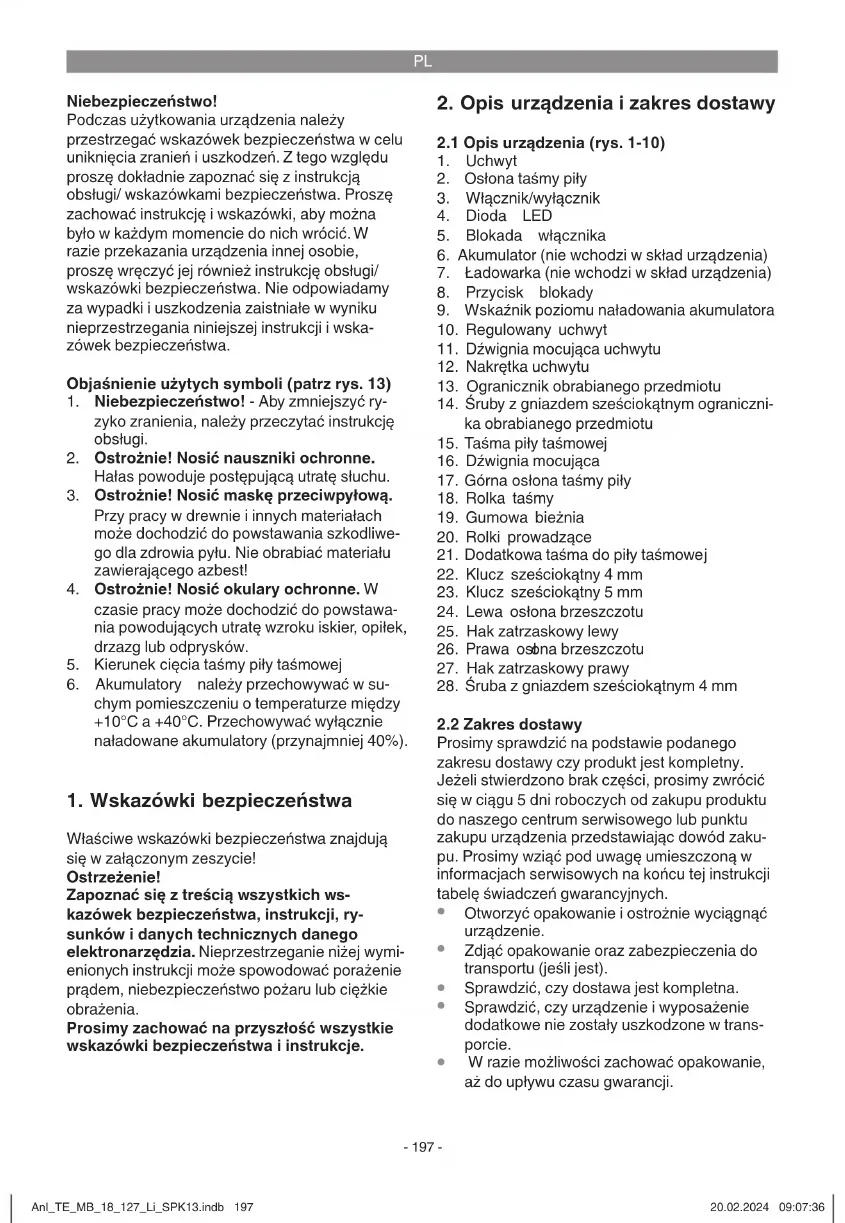 Urządzenie i wyposażenie dodatkowe przechowywać w miejscu ciemnym, suchym i wolnym od przemarzania, zabezpieczyć przed dziećmi. Optymalna temperatura przechowywani 5 do 30˚C. Przechowywać urządzenie w oryginal- nym opakowaniu. Wskazówka! Jeśli urządzenie ma być nieużywane przez dłuższy czas, w celu ochrony taśmę pilarską zaleca się, zmniejszyć naciąg taśmy (patrz punkt 5.5). Oprócz tego przed dłuższym składowaniem urządzenia zalecamy dla ochrony rolek prowadzących (20) posmarować je olejem mineralnym. Anl_TE_MB_18_127_Li_SPK13.indb 203Anl_TE_MB_18_127_Li_SPK13.indb 203 20.02.2024 09:07:3720.02.2024 09:07:37PL