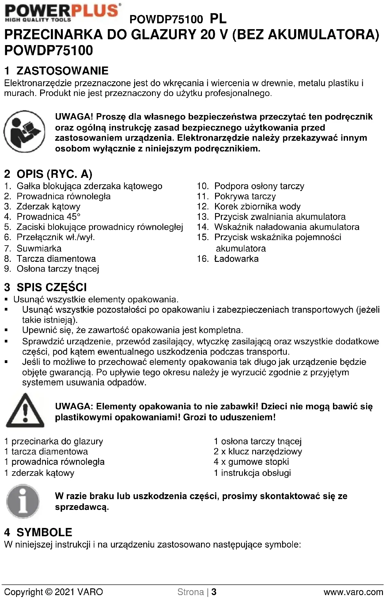 - Jeśli to możliwe to przechować elementy opakowania tak długo jak urządzenie będzie objęte gwarancją. Po upływie tego okresu należy je wyrzucić zgodnie z przyjętym systemem usuwania odpadów. UWAGA: Elementy opakowania to nie zabawki! Dzieci nie mogą bawić się plastikowymi opakowaniami! Grozi to uduszeniem! 1 przecinarka do glazury 1 tarcza diamentowa 1 prowadnica równoległa 1 zderzak kątowy 1 osłona tarczy tnącej 2 x klucz narzędziowy 4 x gumowe stopki 1 instrukcja obsługi W razie braku lub uszkodzenia części, prosimy skontaktować się ze sprzedawcą. 4 SYMBOLE W niniejszej instrukcji i na urządzeniu zastosowano następujące symbole:POWDP75100 PL Copyright © 2021 VARO Strona | 4 www.varo.com