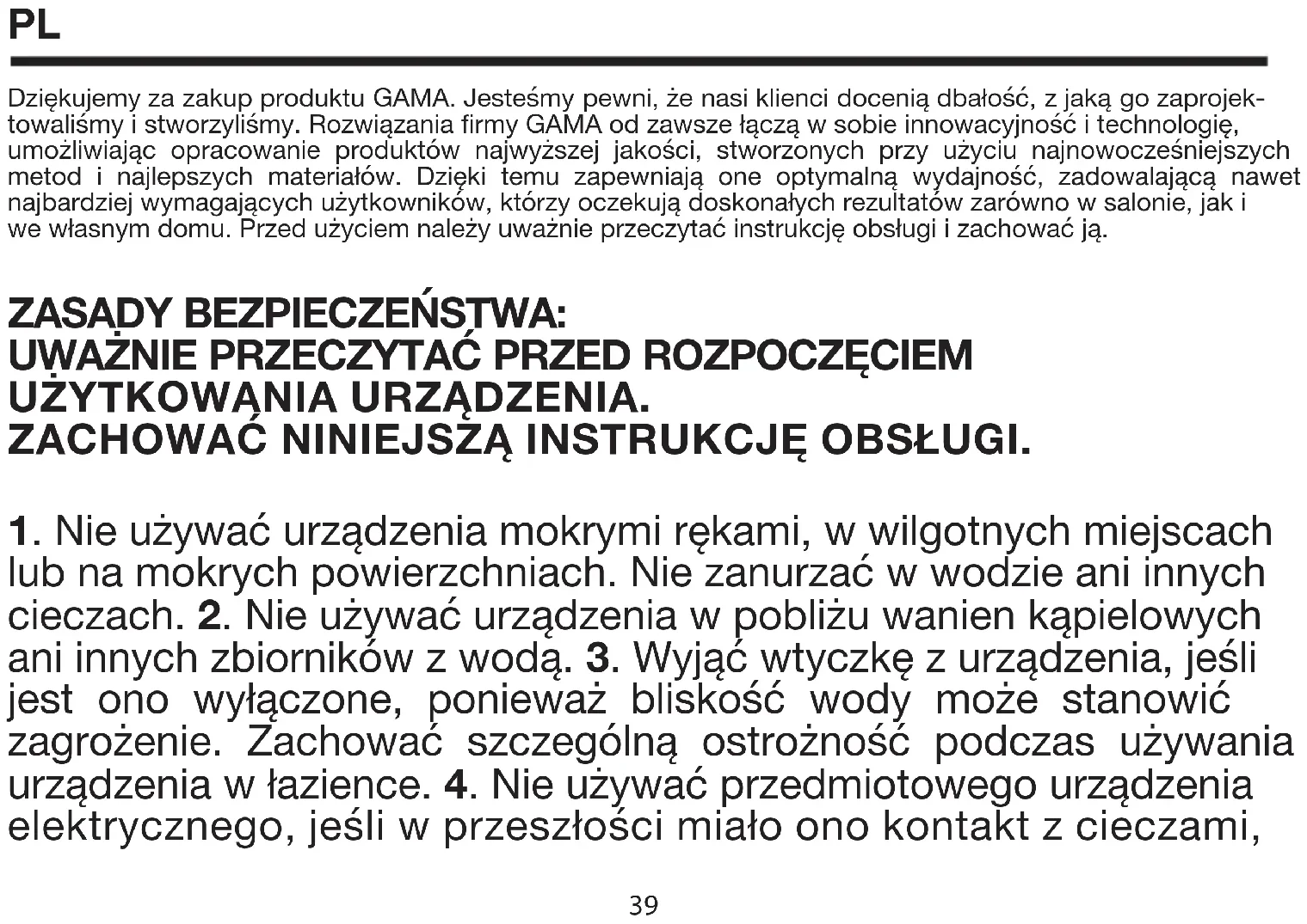 lub na mokrych powierzchniach. Nie zanurzać w wodzie ani innych cieczach. 2. Nie używać urządzenia w pobliżu wanien kąpielowych ani innych zbiorników z wodą. 3. Wyjąć wtyczkę z urządzenia, jeśli jest ono wyłączone, ponieważ bliskość wody może stanowić zagrożenie. Zachować szczególną ostrożność podczas używania urządzenia w łazience. 4. Nie używać przedmiotowego urządzenia elektrycznego, jeśli w przeszłości miało ono kontakt z cieczami, 39jeśli kabel zasilania jest uszkodzony lub jeśli widoczne są wyraźne uszkodzenia zewnętrznej części obudowy czy akcesoriów. W razie nieprawidłowego działania urządzenia, należy bezzwłocznie odłączyć je od źródła prądu i udać się do centrum serwisowego w celu przeprowadzenia kontroli. 5. W celu uniknięcia zagrożeń, w przypadku uszkodzenia kabla zasilania należy bezzwłocznie zwrócić się o jego wymianę do producenta, autoryzowanego centrum serwisowego lub wykwalifikowanego pracownika. 6. Unikać zetknięcia się nagrzanej prostownicy ze skórą – wysoka temperatura może powodować poparzenia. 7. Przechowywać urządzenie oraz kabel zasilania z daleka od źródeł ciepła i powierzchni wrażliwych na ciepło (tworzywa sztuczne, tkaniny winylowe itd.). 8. Nie trzymać ani nie ciągnąć urządzenia za kabel. Nie owijać kabla wokół urządzenia, nie zginać go ani nie skręcać, ponieważ może to prowadzić do niewłaściwego działania i uszkodzenia prostownicy do włosów. Niestosowanie się do powyższych ostrzeżeń i wskazówek może prowadzić do powstania spięcia i nieodwracalnego uszkodzenia prostownicy do włosów oraz zagrażać bezpieczeństwu użytkownika. 9. Uszkodzony kabel zasilający musi być wymieniony przez wykwalifikowanego pracownika. Nie używać urządzeń lub akcesoriów, w których zostały wprowadzone zmiany lub które nie 40de la toma de corriente eléctrica. 11 - Si se desea limpiar el aparato, desenchufarlo de la toma de corriente eléctrica y dejarlo enfriar. Para limpiar el aparato no utilizar productos agresivos que contengan fenilfenol. 12 - Utilizar este producto únicamente para el fin para el cual ha sido creado. 13 - Como medida de protección adicional, se recomienda instalar un interruptor diferencial (RCD, por su sigla original en inglés) con un límite de corte que no exceda los 30 mA, en el circuito eléctrico que alimenta el baño. Consultar con un electricista. Este producto no debe ser utilizado por personas con capacidades físicas (niños incluidos), motoras o mentales reducidas, o con poco conocimiento del producto, salvo que hayan sido instruidas sobre el uso del producto o sean supervisadas por una persona responsable de su seguridad. Los niños deben estar siempre controlados para evitar que jueguen con los productos. No utilizar este aparato cerca de bañeras o de recipientes que contengan agua. Este aparato, para su seguridad, ha sido diseñado con un doble aislamiento. zostały dopuszczone przez producenta. 10. Odłączyć urządzenie po zakończeniu użytkowania i poczekać na jego ochłodzenie przed odłożeniem w bezpieczne miejsce. W celu odłączenia urządzenia wyjąć kabel z wtyczki. 11 . W razie potrzeby oczyszczenia urządzenia należy odłączyć je od gniazdka elektrycznego i poczekać na jego ochłodzenie. Nie czyścić za pomocą agresywnych środków zawierających fenylofenol. 12. Używać urządzenia wyłącznie do celów, dla których zostało ono przeznaczone. 13. Zaleca się zainstalowanie dodatkowego zabezpieczenia w obwodzie elektrycznym zasilania łazienki w postaci wyłącznika różnicowo-prądowego (ang. RCD) o prądzie różnicowym nie większym niż 30 mA. Zasięgnąć porady u zaufanego elektryka. Produktu tego nie mogą używać osoby o ograniczonych zdolnościach fizycznych (w tym dzieci), ruchowych i umysłowych, ani osoby niemające odpowiedniej wiedzy o produkcie, chyba że otrzymały one instrukcje dotyczące użytkowania produktu lub użytkują produkt pod nadzorem osoby odpowiedzialnej za ich bezpieczeństwo. Należy zawsze zwracać uwagę, aby dzieci nie bawiły się tym produktem. 41Nie używać urządzenia w pobliżu wanien kąpielowych ani innych pojemników z wodą. Ze względu na bezpieczeństwo użytkowników niniejsze urządzenie zostało wyposażone w podwójną izolację. Znak zamieszczony na wyrobie lub na opakowaniu oznacza, że urządzenie nie należy do grupy odpadów komunalnych i w razie likwidacji powinno zostać oddane do odpowiedniego punktu zbiórki urządzeń elektrycznych i elektronicznych w celu recyklingu. Właściwa utylizacja tego produktu pozwala uniknąć potencjalnych negatywnych konsekwencji dla środowiska i zdrowia, jakie mogą wynikać z nieodpowiedniego obchodzenia się z produktem. Dokładniejsze informacje dotyczące recyklingu przedmiotowego produktu można uzyskać w urzędzie miasta, u lokalnego dostawcy usług utylizacji odpadów lub w sklepie, w którym dokonano zakupu. OGRANICZONY OKRES GWARANCJI: okres standardowej gwarancji na prostownice do włosów przeznaczone do sprzedaży konsumenckiej wynosi 24 miesiące, zgodnie z postanowieniami dyrektywy 1999/44/WE. Okres gwarancji dla firm na prostownice do włosów wykorzystywane w salonach piękności lub w ramach jakiejkolwiek innej działalności gospodarczej wynosi 12 miesięcy od daty zakupu. 42ESP Gracias por haber adquirido un producto GAMA. Estamos seguros de que sabrás valorar el cuidado con el que ha sido proyectado y realizado. La investigación GAMA continúa, como siempre, conjugando innovación y tecnología para llegar a productos de altísima calidad, creados con las técnicas más modernas y los mejores materiales. Esto garantiza óptimas performances, estudiadas para los usuarios más exigentes que desean obtener un resultado excepcional tanto en el salón profesional como en casa. Antes de utilizarlo, lee atentamente estas instrucciones y consérvalas. ADVERTENCIAS: LEER ATENTAMENTE ANTES D