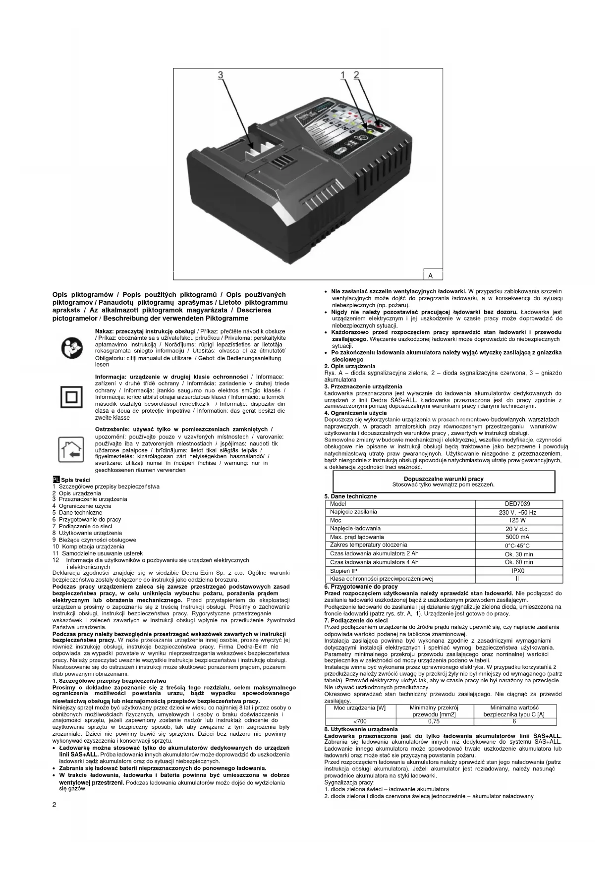 Model DED7039 Napięcie zasilania 230 V, ~50 Hz Moc 125 W Napięcie ładowania 20 V d.c. Max. prąd łądowania 5000 mA Zakres temperatury otoczenia 0°C-45°C Czas ładowania akumulatora 2 Ah Ok. 30 min Czas ładowania akumulatora 4 Ah Ok. 60 min Stopień IP IPX0 Klasa ochronności przeciwporażeniowej