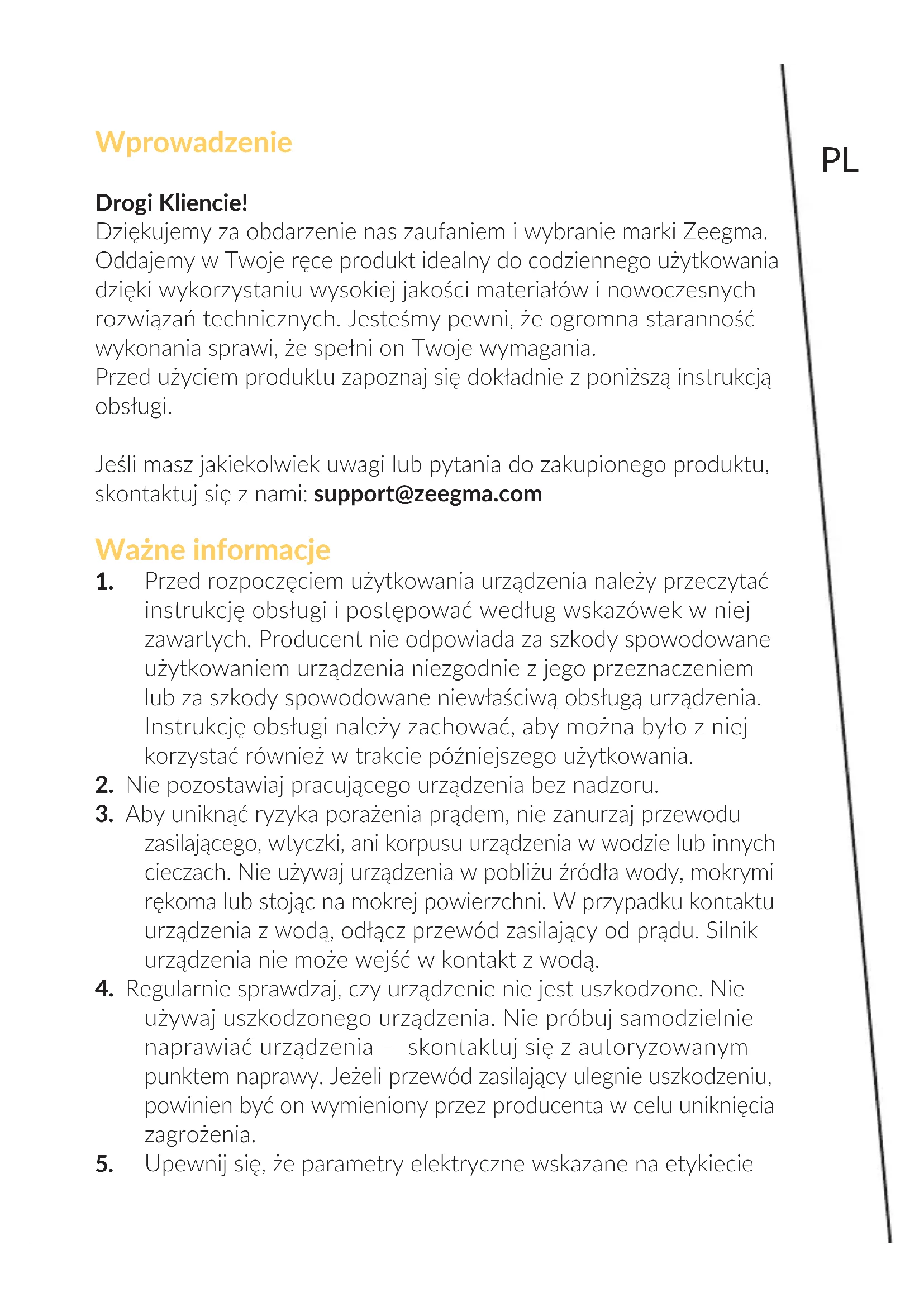 Das Gehäuse des Geräts kann mit einem feuchten Tuch gereinigt werden, nachdem Sie den Glasbehälter enernt haben. Achtung! Reinigen Sie die einzelnen Teile des Geräts sofort nach dem Gebrauch. Achtung! Seien Sie besonders vorsichg, wenn Sie scharfe Teile reinigen. Die Fotos dienen nur zur Veranschaulichung. Das tatsächliche Aussehen der Produkte kann von den Abbildungen abweichen.PL Wprowadzenie Drogi Kliencie! Dziękujemy za obdarzenie nas zaufaniem i wybranie marki Zeegma. Oddajemy w Twoje ręce produkt idealny do codziennego użytkowania dzięki wykorzystaniu wysokiej jakości materiałów i nowoczesnych rozwiązań technicznych. Jesteśmy pewni, że ogromna staranność wykonania sprawi, że spełni on Twoje wymagania. Przed użyciem produktu zapoznaj się dokładnie z poniższą instrukcją obsługi. Jeśli masz jakiekolwiek uwagi lub pytania do zakupionego produktu, skontaktuj się z nami: support@zeegma.com Ważne informacje