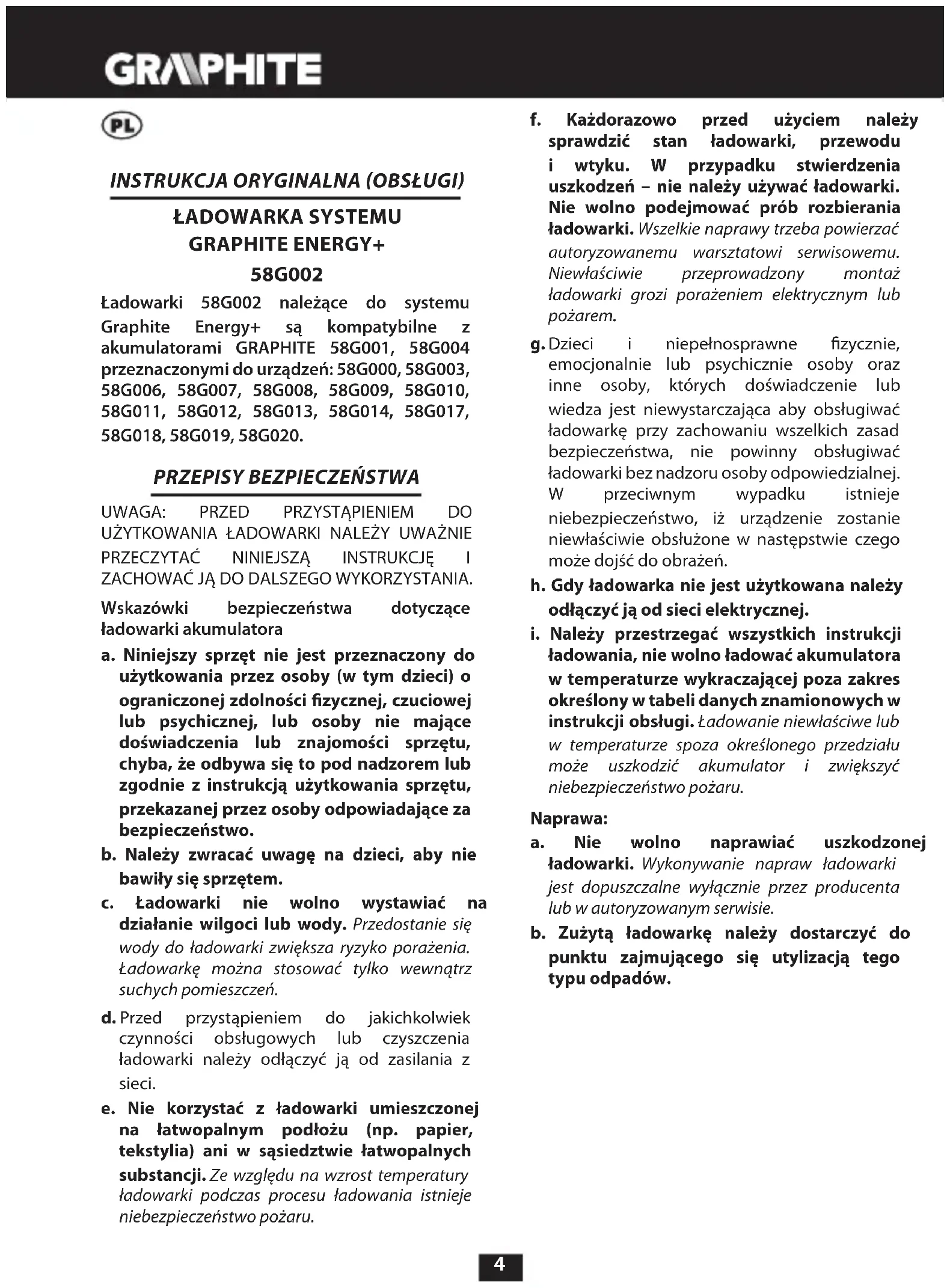 58G002 - Ładowarka do baterii Graphite - Bezpłatna instrukcja obsługi