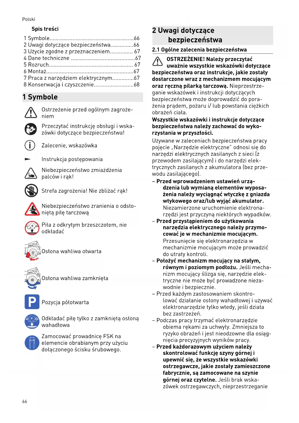 OSTRZEŻENIE! Należy przeczytać uważnie wszystkie wskazówki dotyczące bezpieczeństwa oraz instrukcje, jakie zostały dostarczone wraz z mechanizmem mocującym oraz ręczną pilarką tarczową. Nieprzestrze ganie wskazówek i instrukcji dotyczących bezpieczeństwa może doprowadzić do pora żenia prądem, pożaru i/ lub powstania ciężkich obrażeń ciała. Wszystkie wskazówki i instrukcje dotyczące bezpieczeństwa należy zachować do wyko rzystania w przyszłości. Używane w zaleceniach bezpieczeństwa pracy pojęcie „Narzędzie elektryczne” odnosi się do narzędzi elektrycznych zasilanych z sieci (z przewodem zasilającym) i do narzędzi elek trycznych zasilanych z akumulatora (bez prze wodu zasilającego). – Przed wprowadzeniem ustawień urzą dzenia lub wymianą elementów wyposa żenia należy wyciągnąć wtyczkę z gniazda wtykowego oraz/lub wyjąć akumulator. Niezamierzone uruchomienie elektrona rzędzi jest przyczyną niektórych wypadków. – Przed przystąpieniem do użytkowania narzędzia elektrycznego należy przymo cować je w mechanizmie mocującym. Przesunięcie się elektronarzędzia w mechanizmie mocującym może prowadzić do utraty kontroli. – Położyć mechanizm mocujący na stałym, równym i poziomym podłożu. Jeśli mecha nizm mocujący ślizga się, narzędzie elek tryczne nie może być prowadzone nieza wodnie i bezpiecznie. – Przed każdym zastosowaniem skontro lować działanie osłony wahadłowej i używać elektronarzędzie tylko wtedy, jeśli działa bez zastrzeżeń. – Podczas pracy trzymać elektronarzędzie obiema rękami za uchwyty. Zmniejsza to ryzyko obrażeń i jest nieodzowne dla osiąg nięcia precyzyjnych wyników pracy. – Przed każdorazowym użyciem należy skontrolować funkcję szyny górnej i upewnić się, że wszystkie wskazówki ostrzegawcze, jakie zostały zamieszczone fabrycznie, są zamocowane na szynie górnej oraz czytelne. Jeśli brak wska zówek ostrzegawczych, nieprzestrzeganie Polski 66tychże wskazówek może doprowadzić do podwyższonego niebezpieczeństwa zranienia.