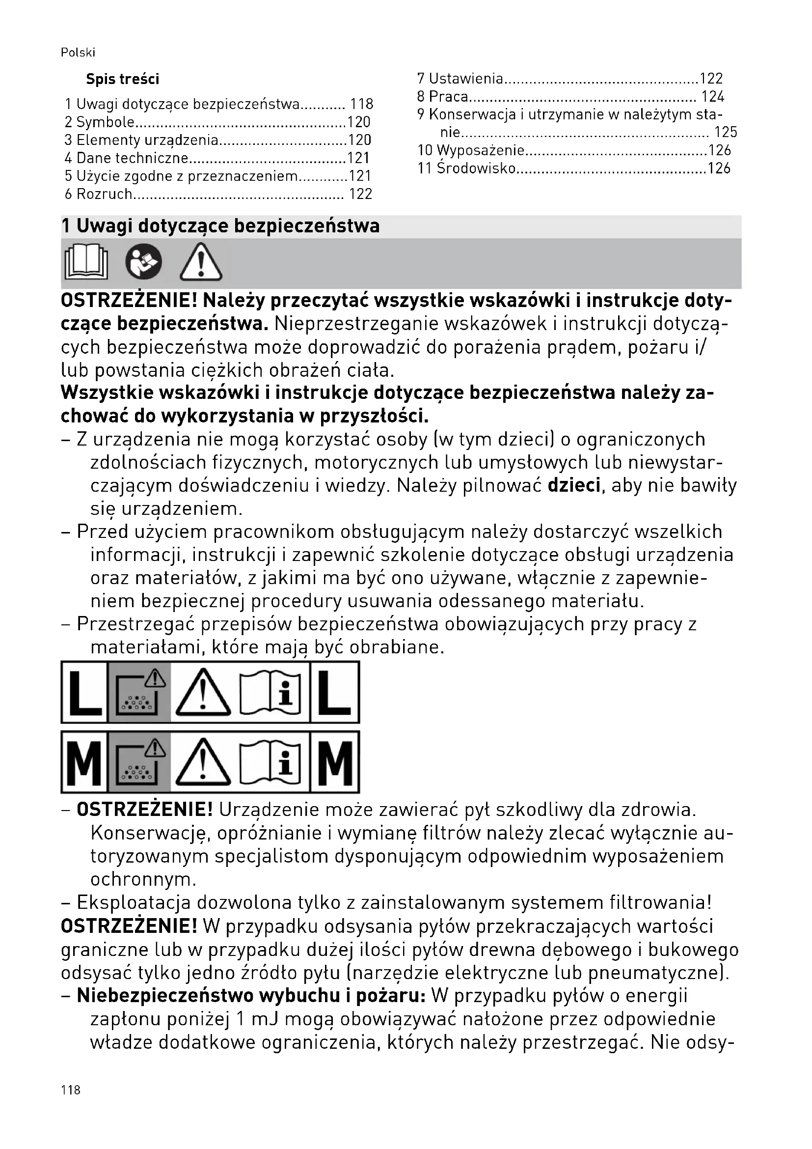 • 11 Środowisko 1 Uwagi dotyczące bezpieczeństwa OSTRZEŻENIE! Należy przeczytać wszystkie wskazówki i instrukcje doty czące bezpieczeństwa. Nieprzestrzeganie wskazówek i instrukcji dotyczą cych bezpieczeństwa może doprowadzić do porażenia prądem, pożaru i/ lub powstania ciężkich obrażeń ciała. Wszystkie wskazówki i instrukcje dotyczące bezpieczeństwa należy za chować do wykorzystania w przyszłości. – Z urządzenia nie mogą korzystać osoby (w tym dzieci) o ograniczonych zdolnościach fizycznych, motorycznych lub umysłowych lub niewystar czającym doświadczeniu i wiedzy. Należy pilnować dzieci, aby nie bawiły się urządzeniem. – Przed użyciem pracownikom obsługującym należy dostarczyć wszelkich informacji, instrukcji i zapewnić szkolenie dotyczące obsługi urządzenia oraz materiałów, z jakimi ma być ono używane, włącznie z zapewnie niem bezpiecznej procedury usuwania odessanego materiału. – Przestrzegać przepisów bezpieczeństwa obowiązujących przy pracy z materiałami, które mają być obrabiane. – OSTRZEŻENIE! Urządzenie może zawierać pył szkodliwy dla zdrowia. Konserwację, opróżnianie i wymianę filtrów należy zlecać wyłącznie au toryzowanym specjalistom dysponującym odpowiednim wyposażeniem ochronnym. – Eksploatacja dozwolona tylko z zainstalowanym systemem filtrowania! OSTRZEŻENIE! W przypadku odsysania pyłów przekraczających wartości graniczne lub w przypadku dużej ilości pyłów drewna dębowego i bukowego odsysać tylko jedno źródło pyłu (narzędzie elektryczne lub pneumatyczne). – Niebezpieczeństwo wybuchu i pożaru: W przypadku pyłów o energii zapłonu poniżej 1mJ mogą obowiązywać nałożone przez odpowiednie władze dodatkowe ograniczenia, których należy przestrzegać. Nie odsy Polski 118sać iskier lub gorących pyłów; Nie zasysać żadnych palnych i wybucho wych cieczy (np. benzyna, rozcieńczalnik); Nie zasysać żadnych żrących cieczy/substancji stałych (np. kwasy, ługi, rozpuszczalniki). Opisywany odkurzacz mobilny nadaje się do zasysania pyłów z lakieru. – Nie wolno uszkodzić przewodu przyłączeniowego (np. przez przejecha nie po nim, szarpanie, ). Chronić przed gorącem, olejem i ostrymi krawędziami. Nie należy wyciągać wtyczki z gniazda ciągnąc za kabel. – Regularnie sprawdzać wtyczkę i kabel, a w razie uszkodzenia zlecić ich wymianę w autoryzowanym warsztacie serwisowym. Przewód zasilający należy wymieniać wyłącznie na typ podany na liście części zamiennych. – Urządzenia nie wolno wystawiać na deszcz. – Ze względów bezpieczeństwa urządzenie należy zasilać wyłącznie z uziemionego gniazda wtykowego. – Gniazdo wtykowe na urządzeniu może być używane tylko zgodnie z prze znaczeniem podanym w instrukcji. – Należy używać wyłącznie oryginalnych akcesoriów firmy Festool. – Gdy urządzenie nie jest używane, jak również przed przystąpieniem do wykonywania wszelkich prac związanych z konserwacją i czyszczeniem urządzenia, należy zawsze wyciągać wtyczkę z gniazda zasilającego. p. 126