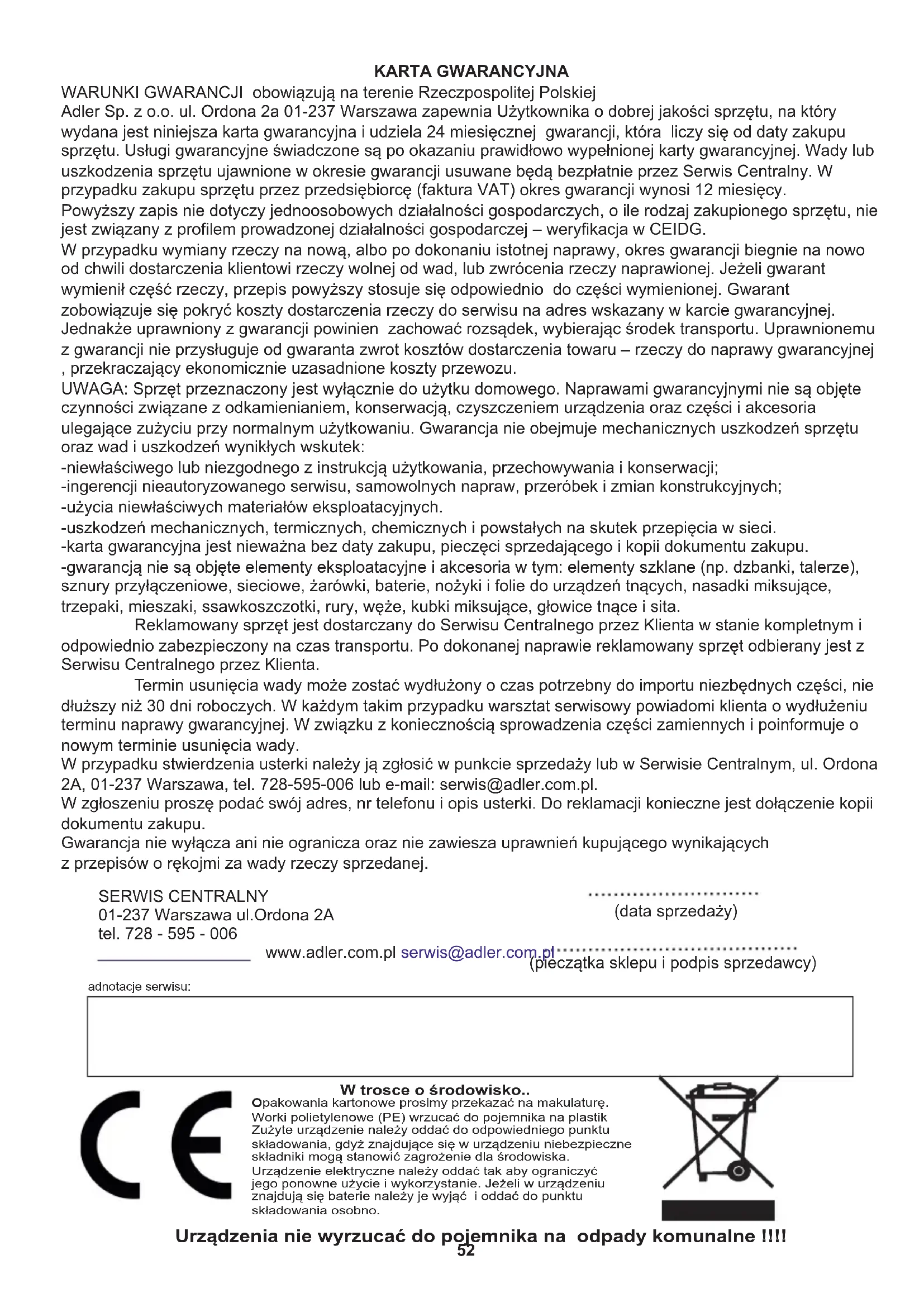 устройство за 5 минути го изключете и го оставете да се охлади. За да защитите околната си среда: моля, отделете картонените кутии и найлоновите торбички и ги изхвърлете в съответните кошчета за отпадъци. Използваният уред трябва да бъде доставен до специалните пунктове за събиране, които могат да повлияят на околната среда. Не изхвърляйте този уред в обикновен кош за отпадъци.52 KARTA GWARANCYJNA WARUNKI GWARANCJI obowiązują na terenie Rzeczpospolitej Polskiej Adler Sp. z o.o. ul. Ordona 2a 01-237 Warszawa zapewnia Użytkownika o dobrej jakości sprzętu, na który wydana jest niniejsza karta gwarancyjna i udziela 24 miesięcznej gwarancji, która liczy się od daty zakupu sprzętu. Usługi gwarancyjne świadczone są po okazaniu prawidłowo wypełnionej karty gwarancyjnej. Wady lub uszkodzenia sprzętu ujawnione w okresie gwarancji usuwane będą bezpłatnie przez Serwis Centralny. W przypadku zakupu sprzętu przez przedsiębiorcę (faktura VAT) okres gwarancji wynosi 12 miesięcy. Powyższy zapis nie dotyczy jednoosobowych działalności gospodarczych, o ile rodzaj zakupionego sprzętu, nie jest związany z profilem prowadzonej działalności gospodarczej – weryfikacja w CEIDG. W przypadku wymiany rzeczy na nową, albo po dokonaniu istotnej naprawy, okres gwarancji biegnie na nowo od chwili dostarczenia klientowi rzeczy wolnej od wad, lub zwrócenia rzeczy naprawionej. Jeżeli gwarant wymienił część rzeczy, przepis powyższy stosuje się odpowiednio do części wymienionej. Gwarant zobowiązuje się pokryć koszty dostarczenia rzeczy do serwisu na adres wskazany w karcie gwarancyjnej. Jednakże uprawniony z gwarancji powinien zachować rozsądek, wybierając środek transportu. Uprawnionemu z gwarancji nie przysługuje od gwaranta zwrot kosztów dostarczenia towaru – rzeczy do naprawy gwarancyjnej , przekraczający ekonomicznie uzasadnione koszty przewozu. UWAGA: Sprzęt przeznaczony jest wyłącznie do użytku domowego. Naprawami gwarancyjnymi nie są objęte czynności związane z odkamienianiem, konserwacją, czyszczeniem urządzenia oraz części i akcesoria ulegające zużyciu przy normalnym użytkowaniu. Gwarancja nie obejmuje mechanicznych uszkodzeń sprzętu oraz wad i uszkodzeń wynikłych wskutek: -niewłaściwego lub niezgodnego z instrukcją użytkowania, przechowywania i konserwacji; -ingerencji nieautoryzowanego serwisu, samowolnych napraw, przeróbek i zmian konstrukcyjnych; -użycia niewłaściwych materiałów eksploatacyjnych. -uszkodzeń mechanicznych, termicznych, chemicznych i powstałych na skutek przepięcia w sieci. -karta gwarancyjna jest nieważna bez daty zakupu, pieczęci sprzedającego i kopii dokumentu zakupu. -gwarancją nie są objęte elementy eksploatacyjne i akcesoria w tym: elementy szklane (np. dzbanki, talerze), sznury przyłączeniowe, sieciowe, żarówki, baterie, nożyki i folie do urządzeń tnących, nasadki miksujące, trzepaki, mieszaki, ssawkoszczotki, rury, węże, kubki miksujące, głowice tnące i sita. Reklamowany sprzęt jest dostarczany do Serwisu Centralnego przez Klienta w stanie kompletnym i odpowiednio zabezpieczony na czas transportu. Po dokonanej naprawie reklamowany sprzęt odbierany jest z Serwisu Centralnego przez Klienta. Termin usunięcia wady może zostać wydłużony o czas potrzebny do importu niezbędnych części, nie dłuższy niż 30 dni roboczych. W każdym takim przypadku warsztat serwisowy powiadomi klienta o wydłużeniu terminu naprawy gwarancyjnej. W związku z koniecznością sprowadzenia części zamiennych i poinformuje o nowym terminie usunięcia wady. W przypadku stwierdzenia usterki należy ją zgłosić w punkcie sprzedaży lub w Serwisie Centralnym, ul. Ordona 2A, 01-237 Warszawa, tel. 728-595-006 lub e-mail: serwis@adler.com.pl. W zgłoszeniu proszę podać swój adres, nr telefonu i opis usterki. Do reklamacji konieczne jest dołączenie kopii dokumentu zakupu. Gwarancja nie wyłącza ani nie ogranicza oraz nie zawiesza uprawnień kupującego wynikających z przepisów o rękojmi za wady rzeczy sprzedanej. SERWIS CENTRALNY 01-237 Warszawa ul.Ordona 2A tel. 728 - 595 - 006 www.adler.com.pl serwis@adler.com.pl (data sprzedaży) (pieczątka sklepu i podpis sprzedawcy) adnotacje serwisu: Urządzenia nie wyrzucać do pojemnika na odpady komunalne !!!! W trosce o środowisko.. Opakowania kartonowe prosimy przekazać na makulaturę.Worki polietylenowe (PE) wrzucać do pojemnika na plastikZużyte urządzenie należy oddać do odpowiedniego punktu składowania, gdyż znajdujące się w urządzeniu niebezpieczne składniki mogą stanowić zagrożenie dla środowiska. Urządzenie elektryczne należy oddać tak aby ograniczyćjego ponowne użycie i wykorzystanie. Jeżeli w urządzeniuznajdują się baterie należy je wyjąć i oddać do punktu składowania osobno.53